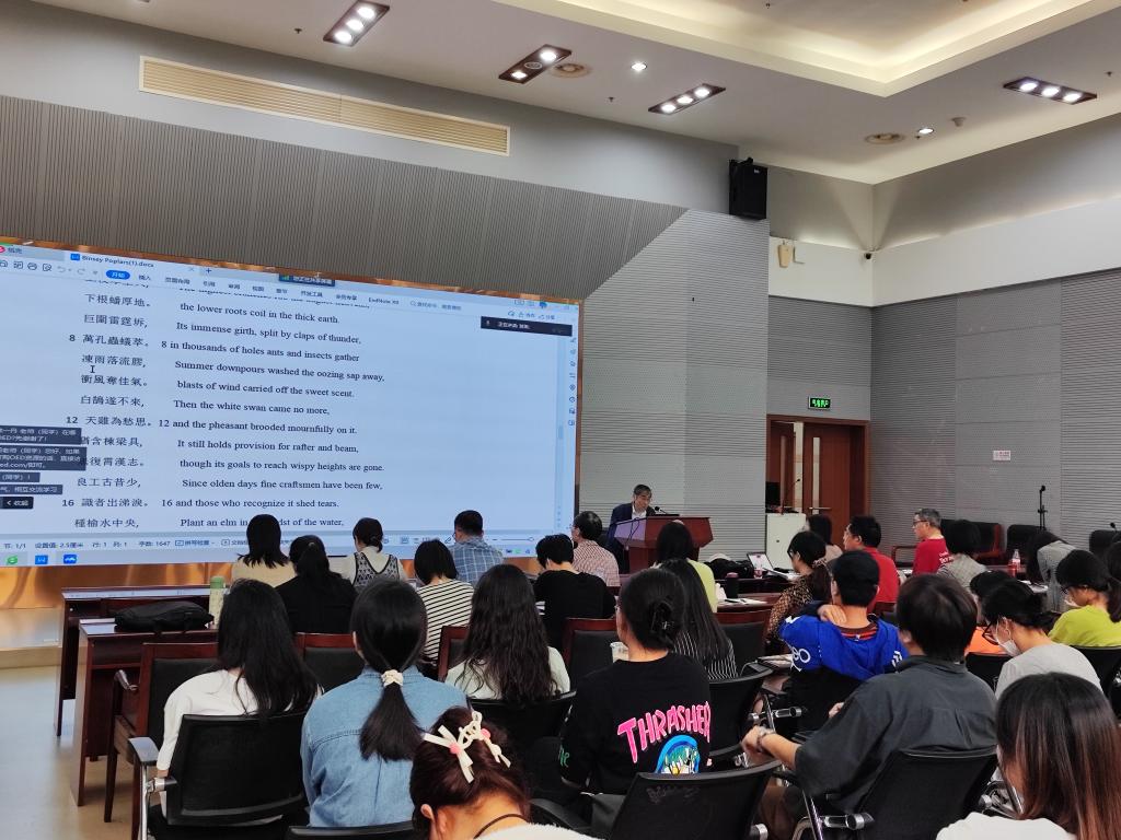 陆建德以“涧底松”“空谷幽兰”等作为切入点,探讨文学艺术作品的寓意及其价值观念的映射。通过赏析杰拉德·曼雷·霍普金斯的“Binsey Poplars”和罗伯特·弗罗斯特的“Tree at My Window”等英文诗歌,引导师生在诗歌中感受人与树的情感联结和交流。陆建德导入杜甫的《病柏》《古柏行》等诗作及其英文译本,对杜诗背后的“栋梁之才”和“才大难为用”的想象进行分析,并从这些关于“树与人”的中英文诗作的比较中,探究不同文化和时代背景下诗歌流派、意象和情感映射的差异。现场,陆建德也详尽回答现场师生及线上听众提问,鼓励青年师生尊重并投入到所热爱的领域,成就自我,贡献社会。