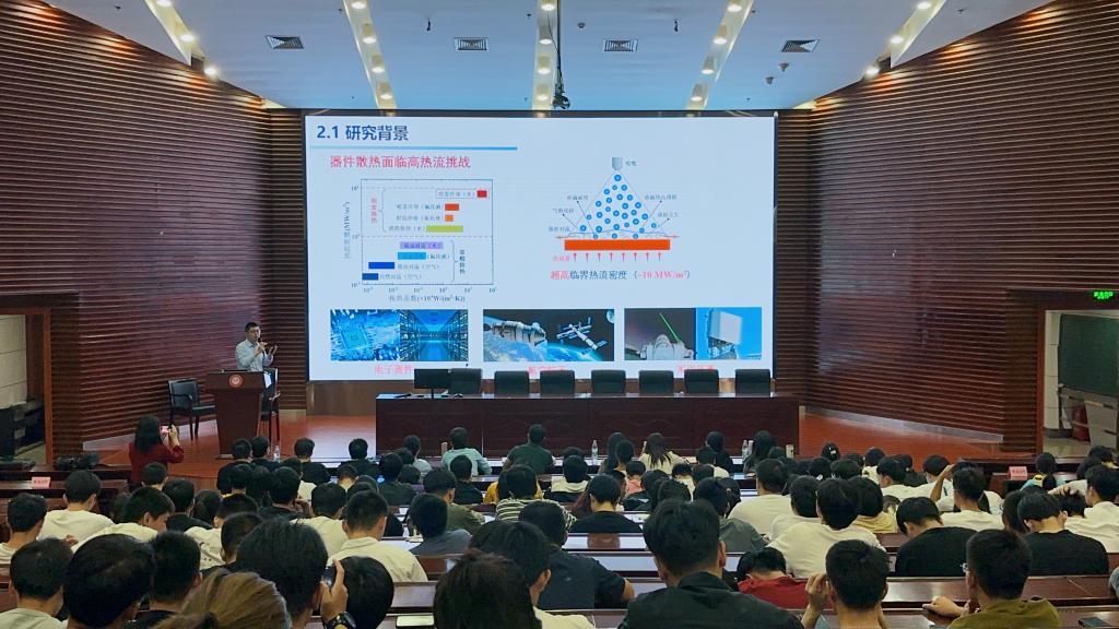 液滴撞击高温表面是近些年兴起的关于液滴撞击研究,其结果可广泛应用于能源动力、航空航天、工程应用等领域。屈教授通过生动的讲解为师生们介绍了高温表面结构和润湿状况对液滴撞击过程中的接触铺展规律和沸腾行为特征,核化气泡等不同因素对气泡生成的影响。该过程研究涉及气液两相流、传热学等理论,其不仅可以完善相关理论,而且对提高相应工程设计经验具有重要指导意义。屈教授的精彩阐述引起了师生们的热烈讨论。在师生交流环节当中,师生们从不同的角度分享了自己的观点与思考,并提出了诸多富有启发意义的问题。最后,屈教授盛赞了集美大学诚毅学院美丽的学习环境,并亲切寄语勉励同学们珍惜时光好好学习。师生们纷纷表示,通过这次讲座,对电子元器件先进散热技术有了更加深刻的认识和了解。