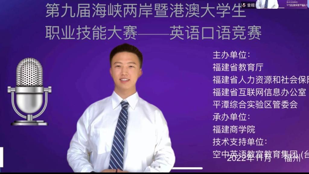 第九届海峡两岸暨港澳大学生职业技能大赛是由福建省教育厅、福建省人力资源和社会保障厅等单位主办,海峡两岸职业教育交流合作中心、福建省职业技能鉴定指导中心等单位承办。本次竞赛采用线上方式分两轮进行,包括定题演讲、即兴演讲和自由答辩等环节。大赛主要考查、评测选手的语言能力、思辨能力、创新能力和跨文化交际能力等。我院外语系提前组织谋划,为学生顺利参赛搭建了专业的技能交流和展示平台。
