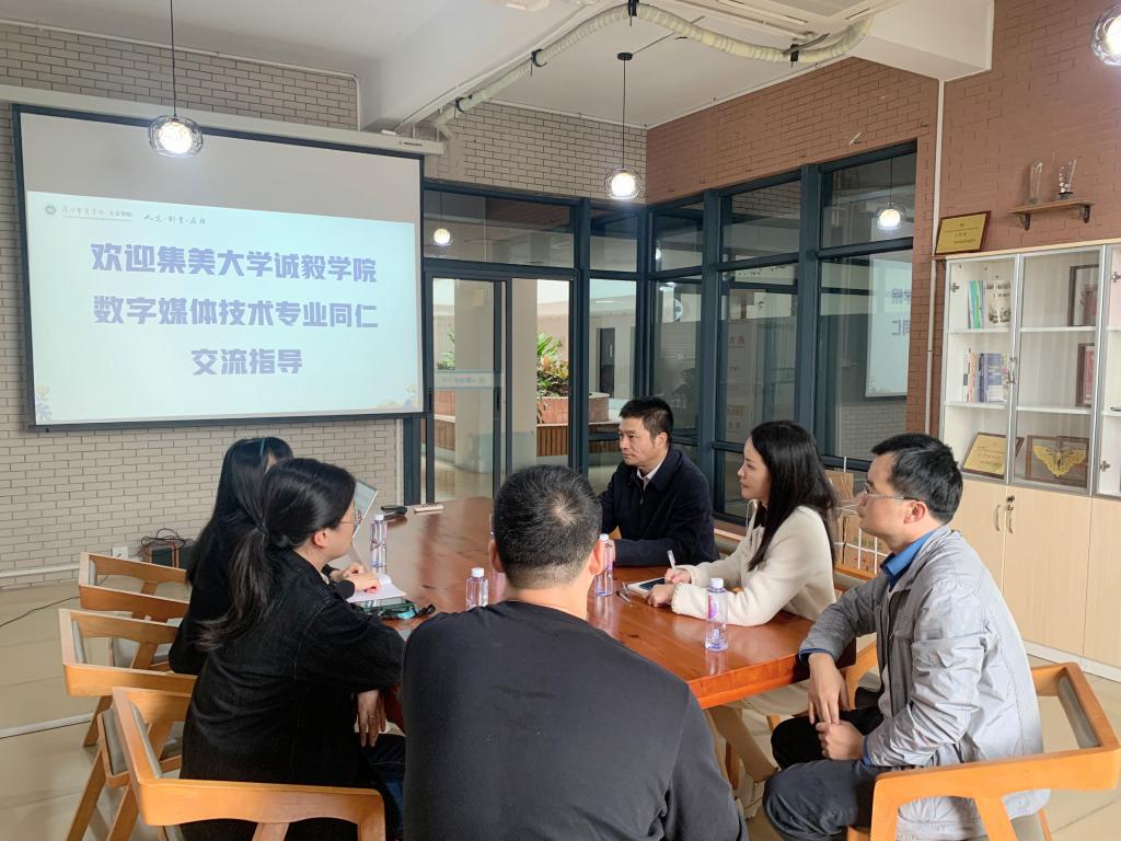 华厦学院人文学院数字媒体艺术专业负责人兼创意系主任何婷主任,以及交互技术课程组长陈小满老师、游戏课程组长郑帅副教授等专业骨干师资与我系老师在数字媒体专业课程及专业合作与共建、数字媒体技术专业工作室和实验室建设、专业成果转化和人才培养的模式和方法进行深入的探讨。