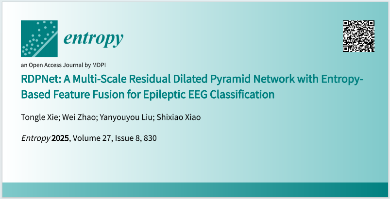 2025 年 8 月 5 日,集美大学诚毅学院大数据分析实验室的研究论文“RDPNet: A Multi-scale Residual Dilated Pyramid Network with Entropy-Based Feature Fusion for Epileptic EEG Classification”(RDPNet:一种基于熵特征融合的多尺度残差膨胀金字塔网络用于癫痫脑电分类)在国际统计物理期刊《Entropy》(JCR-Q2,中科院 3 区)在线发表。该成果以集美大学诚毅学院为独立完成单位,是数学与数字科学系数科2292班谢同乐(第一作者)和数媒2293班刘彦佑佑在赵伟副教授(共同第一作者、通讯作者)和肖世校教授的指导下完成,实现了数科系学生第一作者在SCI期刊发表论文零的突破。