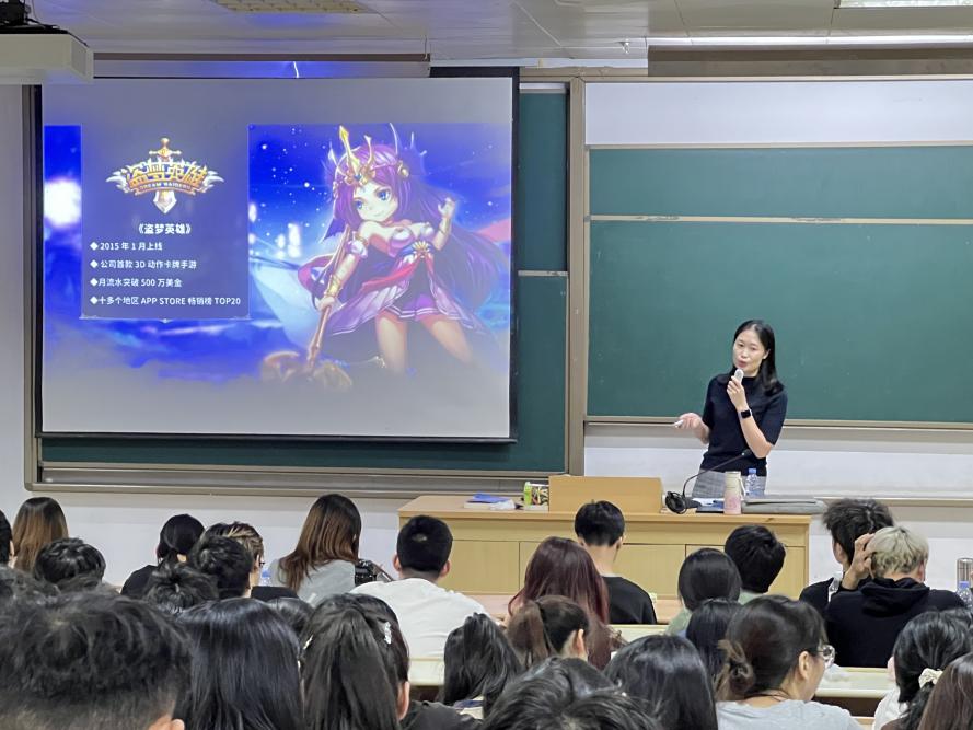 梦加网络人力资源总监彭秋玫通过精心准备的演示材料、生动详实的行业案例,为在场的数字媒体技术专业学生系统介绍了游戏行业的发展现状、市场趋势、职业发展路径,以及企业的发展脉络、人才理念,为有志于投身该领域的学生搭建了认知桥梁。针对数字媒体技术专业的人才培养方向,她重点推介了游戏程序类、游戏策划类、游戏美术类、发行类和文创类等岗位,详细说明了各类职位的专业要求、职责内涵,让学生对岗位需求有了具象化认知。