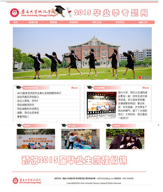 1、访问地址:http://cybyj.jmu.edu.cn/;或点击“学院新闻网”→“专题策划”栏目→“2015毕业季专题网”