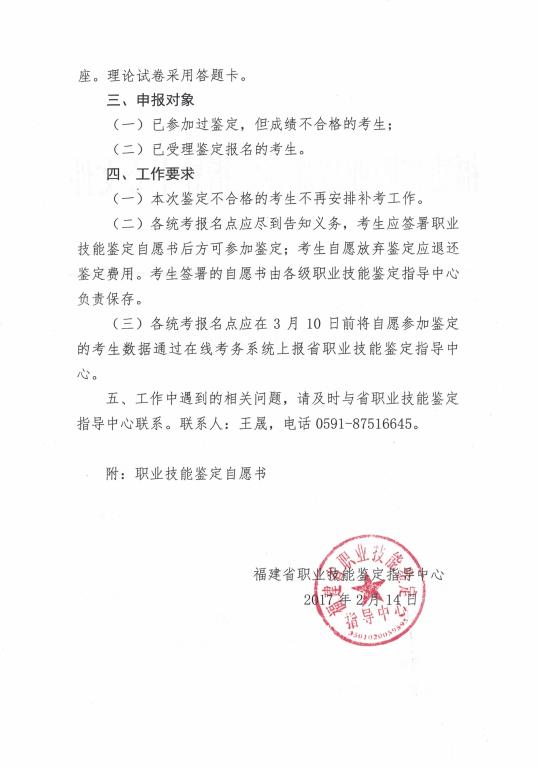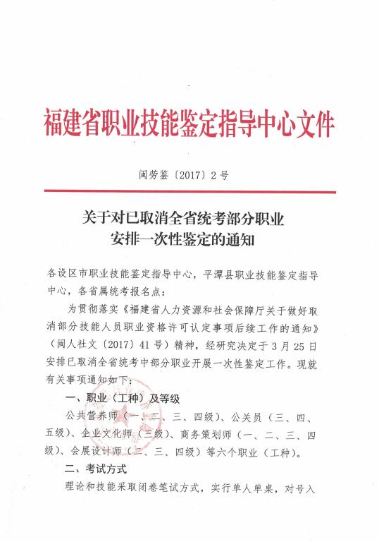 转发:福建省职业技能鉴定指导中心《关于对已取消全省统考部分职业安排一次性鉴定的通知》(闽劳鉴【2017】2号)。