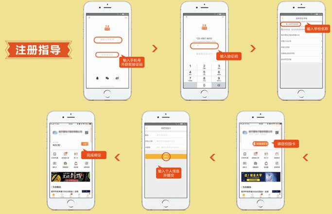 2、安装完成后打开APP,输入手机号→输入验证码→选择学校,在成功登入完美校园APP后,按照屏幕提示录入学号/卡号、卡密码即可进行绑定操作,成功绑定后,就可以正常使用。