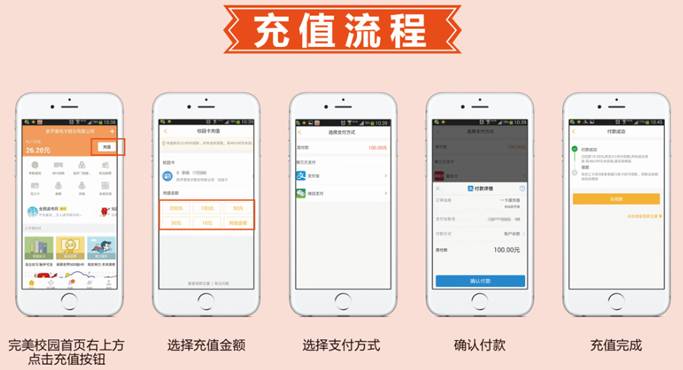 手机登录微信APP客户端→添加关注“新开普完美校园”公众号→绑定校园卡(在卡号处填写学号/工号/校园卡上编号,注:与完美校园注册操作类似)→充值。