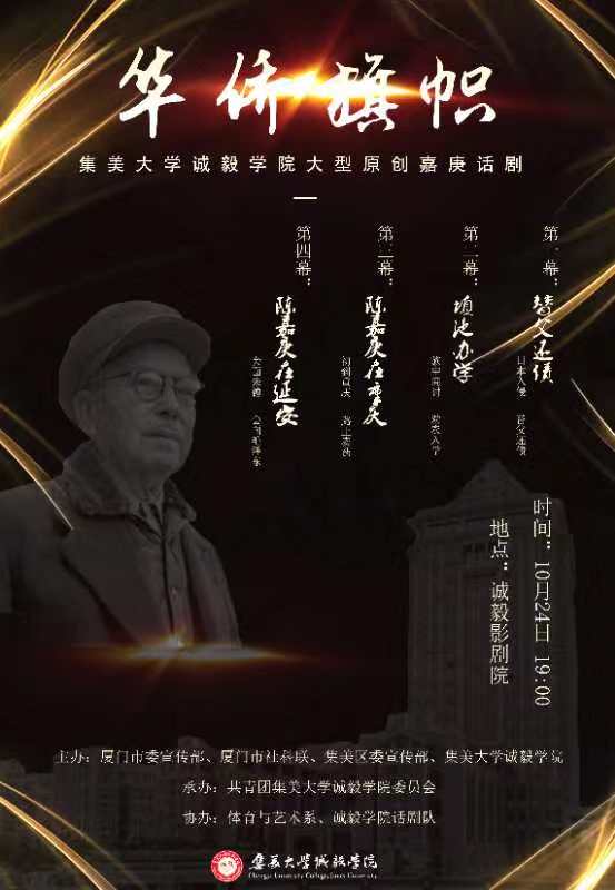 简介:《华侨旗帜》参演演职人员全部为我院在读学生,而且将在校园中定期演出,该剧演绎了我院校主陈嘉庚先生替父还债、倾资兴学、支持抗战的感人事迹和爱国情怀,全剧以现实主义话剧为基础,融入舞蹈和朗诵等元素,结合写实与写意,将历史回顾、爱国教育与文化反思溶于其中,是我院师生以身演绎,为百年校庆精心准备的大型原创话剧。此次演出,在2018年6月份公演的基础上,继续雕琢,精益求精,以更加震撼宏大的演出效果为集大百年校庆献礼。