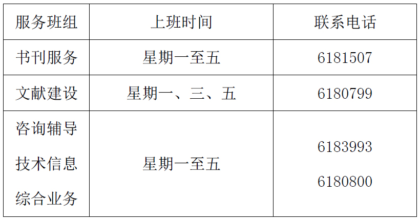 技术信息:图书馆系统、资源平台使用,在线咨询(QQ:86037603,电话:18120788840)。
