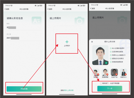 3. 参照提示完成人像采集。可选择符合标准的照片上传或者打开手机相机拍摄采集上传(注意:请一定上传近期照片,以确保被识别率)。