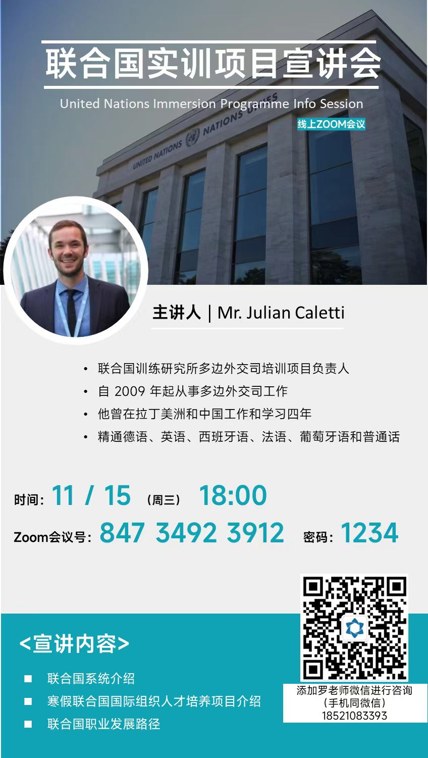 联合国2024寒假实训项目:11月17日完成外方报名,11月20日将所有报名材料提交至对外交流合作部(景祺楼1206),电子版发送至120573042@qq.com,联系电话:6182952(关老师)。