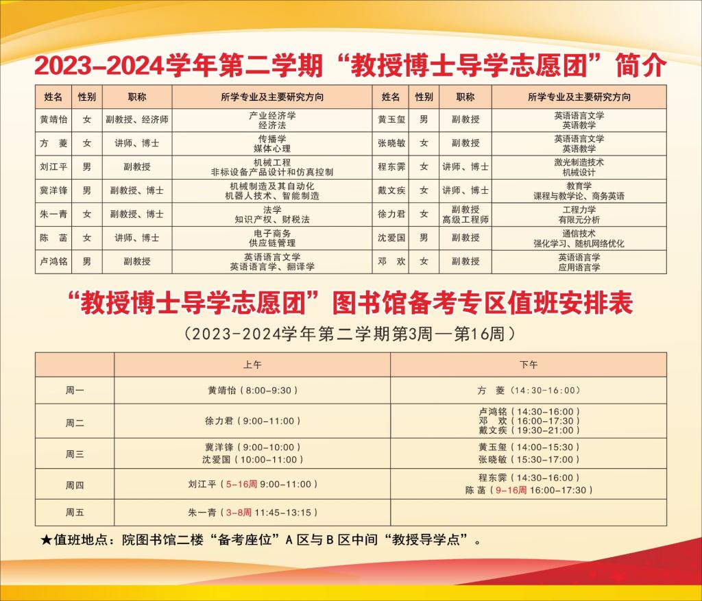 2023-2024学年第二学期“教授博士导学志愿团”简介及值班安排表