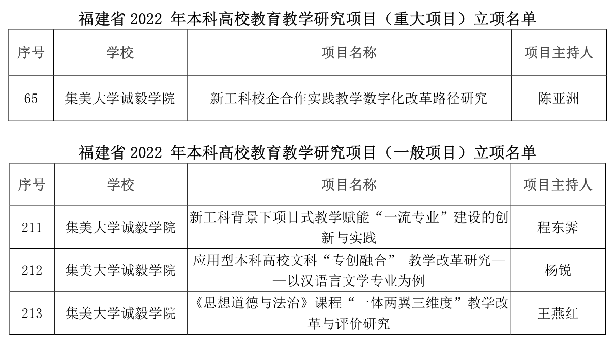 近日,福建省教育厅发布《关于公布2022年本科高校教育教学研究项目立项名单的通知》(闽教高〔2022〕36号),我院1个项目入选福建省2022年本科高校教育教学研究重大项目,3个项目入选福建省2022年本科高校教育教学研究一般项目,入选项目数居全省独立学院第一。