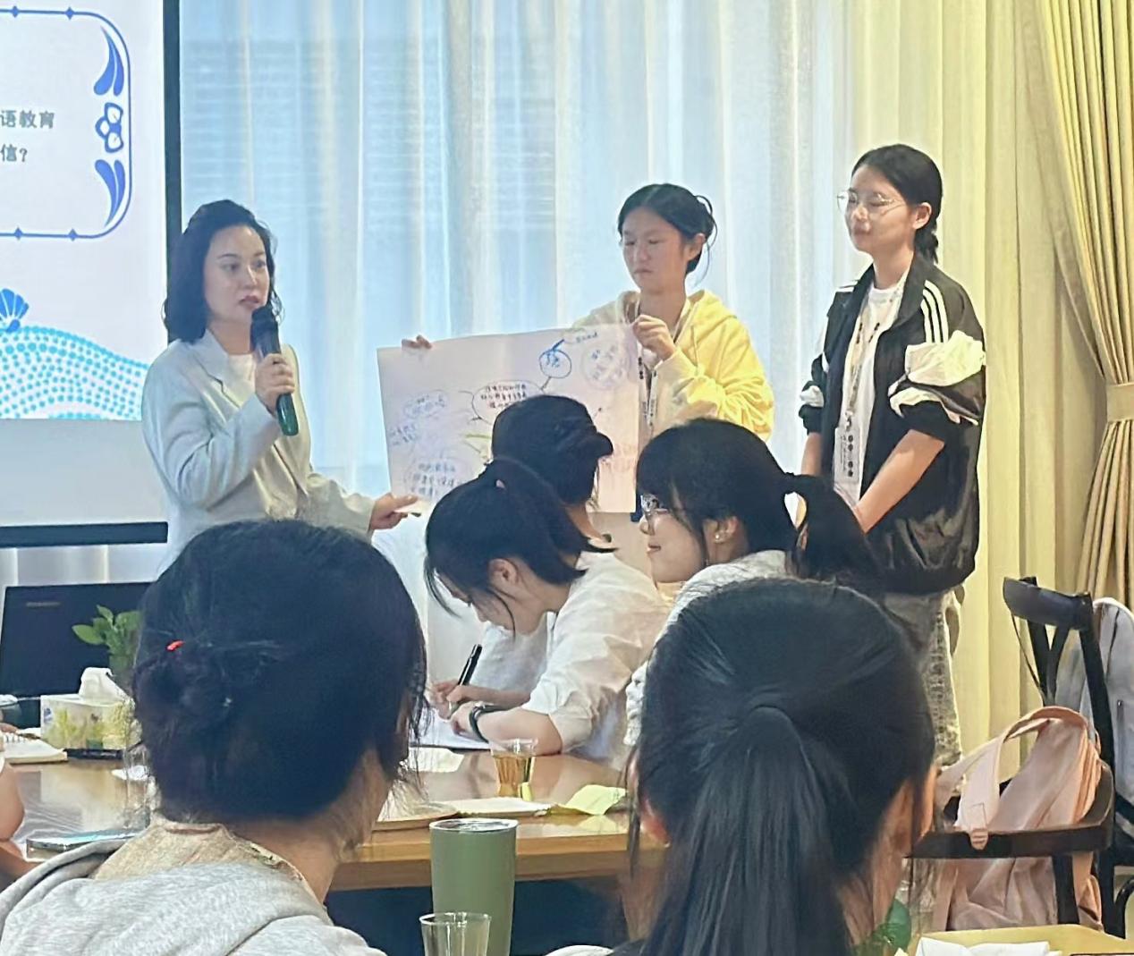 展演结束后,学生们与戴文疾老师、厦门市教育科学研究院高级教师段艳霞,厦门华厦学院人文学院教授、教育学博士胡永红以及英才幼儿园园长赖敏利一行共同参与英语周大教研活动。教研活动中,学生、老师和专家分成5个小组,结合大学生传统故事展演和英才幼儿园外教AJ与学生的课堂活动视频的节选,围绕“传统文化如何在幼儿英语教育中培养,提升文化自信?”的问题展开了深入的思考与讨论。教研活动不仅让同学们更加清晰地认识到了自己在实践活动中存在的问题与不足,更激发了他们积极解决问题的热情与主动性,专注教学方法的学习与研究,以实现书本知识到实践应用的有效转化。