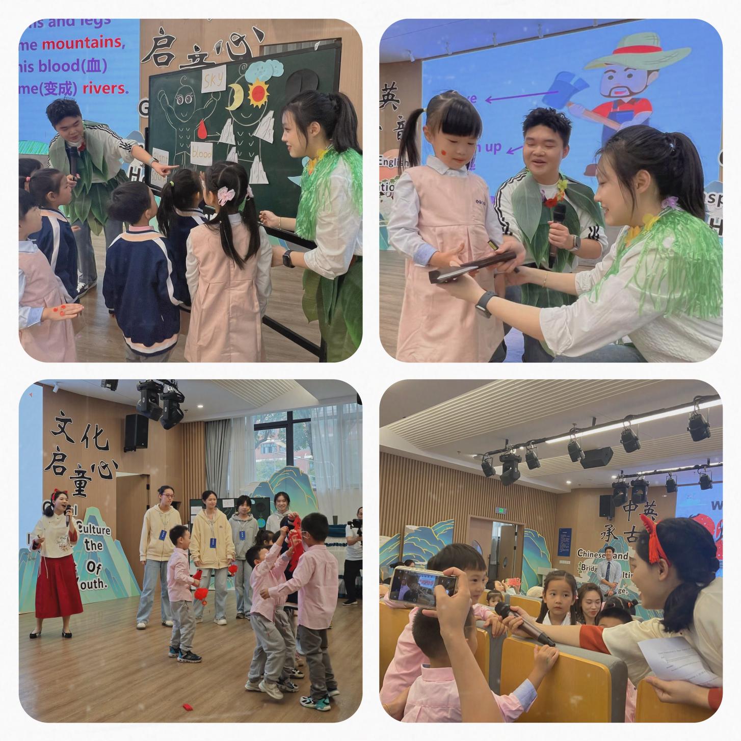 一个多月来,戴文疾和参与实践教学活动的同学们对英才幼儿园全英班学生的学情进行了细致的分析,深入研读《英语教学法教程》与《英语课程标准(2022年版)》,并据此完成了“用英语讲述中国传统故事”教案的制定与课堂的教学设计。备课过程中,学生们通过PowerPoint展示与Demo展演模拟真实的教学场景,戴文疾根据学生的展演情况给予了详尽的指导,师生共同修改教案并不断完善教学活动。在英才幼儿园的舞台上,同学们精彩演绎《盘古开天辟地》与《春节的由来——年兽的故事》两个传统故事,点燃幼儿对中华传统文化的热爱,为孩子们搭建英语实践平台,赢得了孩子们的热烈反响与英才幼儿园老师的高度评价。