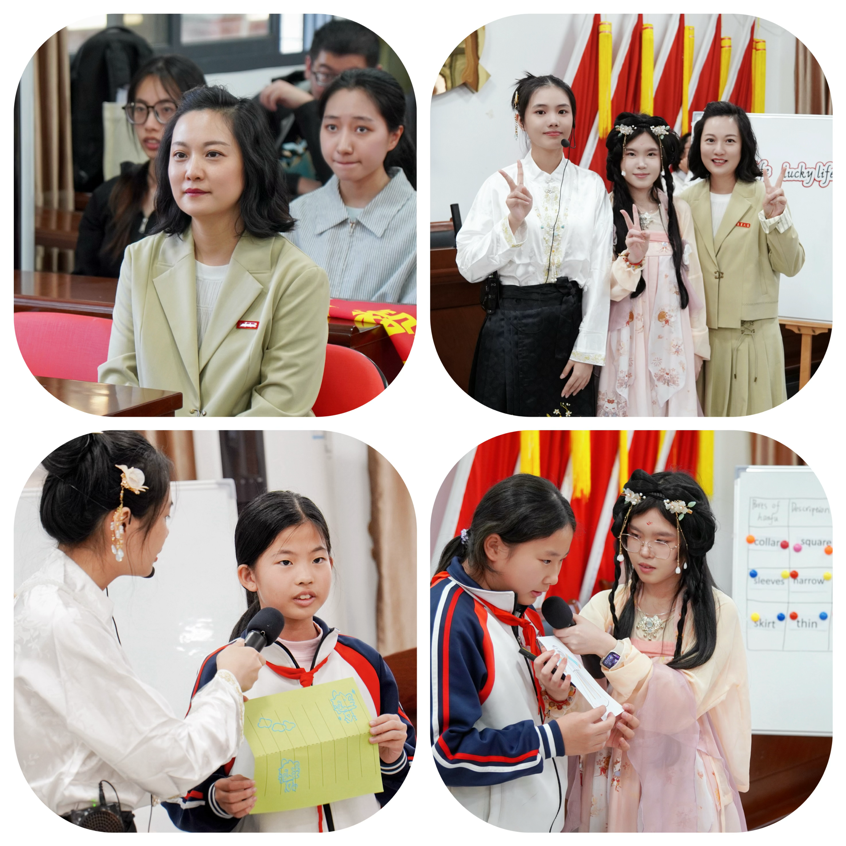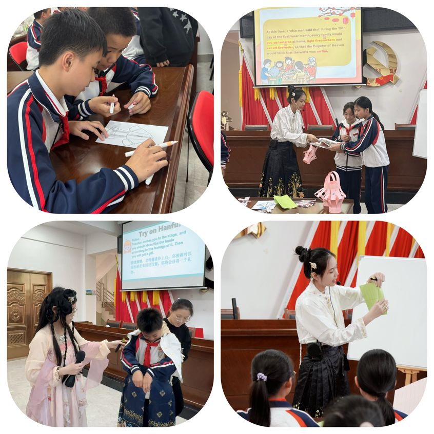 实践课堂分别为地尾小学的同学们介绍汉服,讲述元宵节的故事与习俗。在介绍汉服环节里,大学生们通过PPT和视频展示汉服历史、款式及文化,并让同学们试穿体验,鼓励大家设计汉服并用英语描述设计理念。随后的元宵节环节,大学生们讲述节日故事与习俗,带领同学们制作灯笼,用英语分享喜悦,既锻炼动手能力又感受传统文化魅力。
