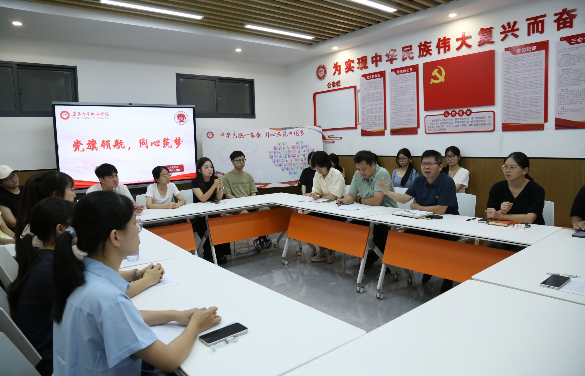 为铸牢中华民族共同体意识,凝聚各民族青年奋斗力量,9月24日,人文科学系在“一站式”学生社区举办“党旗领航,同心筑梦”人文故事分享会。系党委书记许弘明,系党委组织员、辅导员代表及部分学生党员、入党积极分子、少数民族学生代表参加。