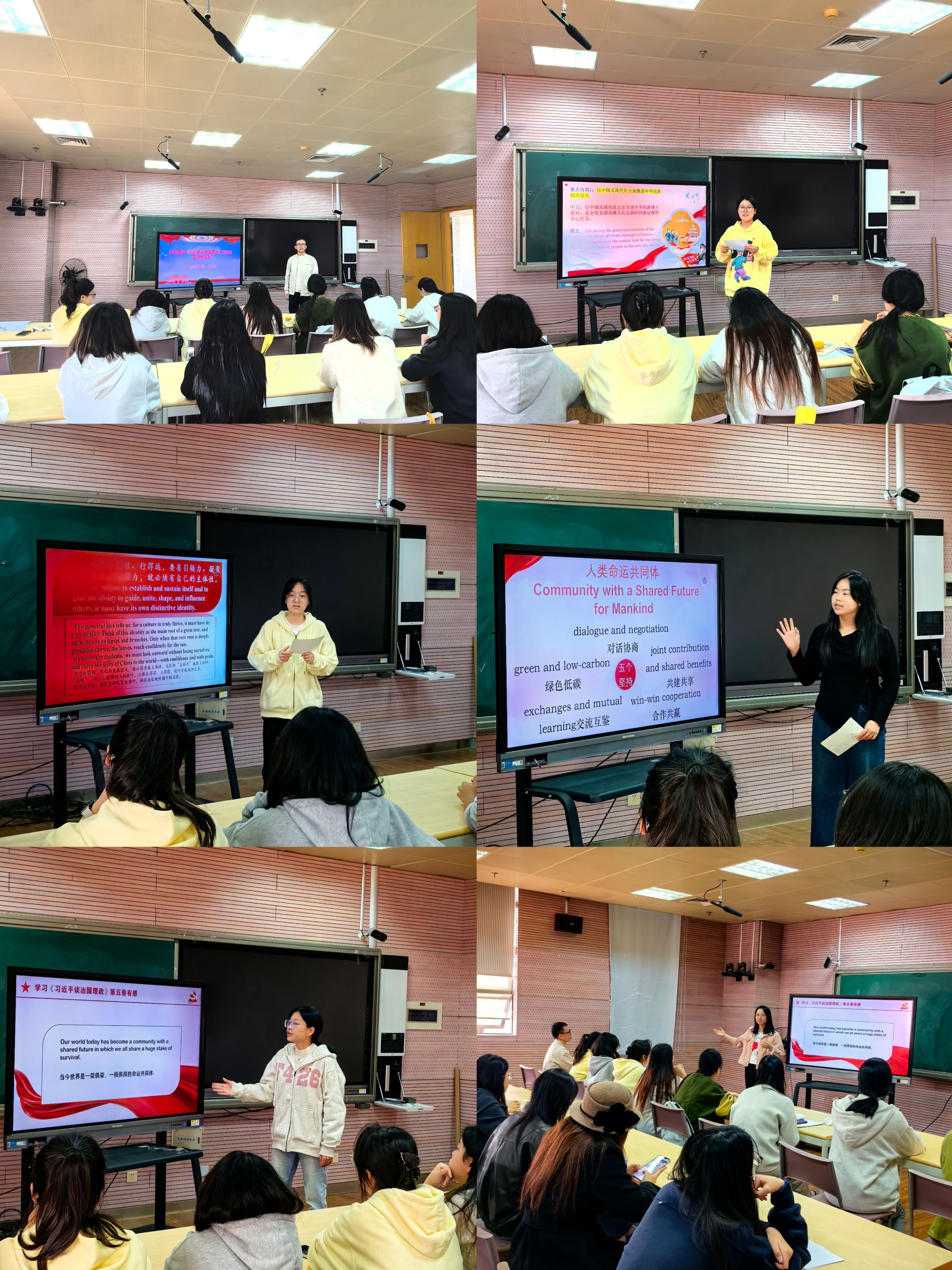 随后,学生第一党支部召开学习贯彻《习近平谈治国理政》第五卷交流分享会,学生党员们用中英双语围绕“人民至上”“中国式现代化”“人类命运共同体”等关键词进行阐述,纷纷表达了要将青春梦想融入实现中国梦伟大新征程的坚定决心。教工党支部党员老师对同学们的分享进行点评。