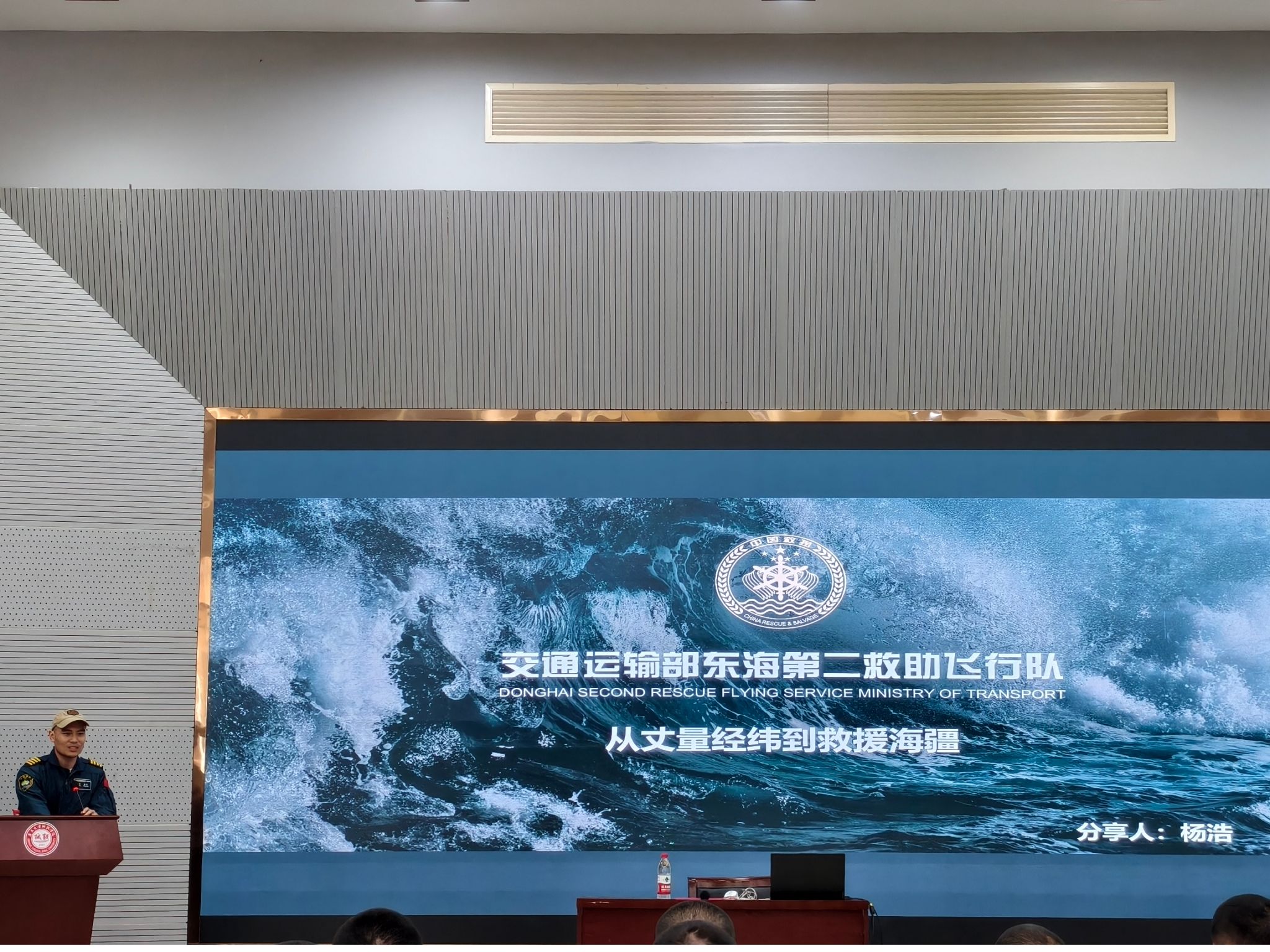 杨浩现任交通运输部东海第二救助飞行队海上搜救直升机机长、民航二级飞行员,曾获国际海事组织(IMO)海上特别勇敢奖表扬信、荣登“2024年救捞光荣榜”。他以“从丈量经纬到救援海疆”为主题,结合 “闽龙渔66822”“岱油 69”等真实惊险的救援案例,诠释“把生的希望送给别人,把死的危险留给自己”的救助精神。交流环节中,杨浩解答同学们关于专业素养、职业考证、海上安全等疑问,分享从业经验,鼓励大家坚定专业信念、锤炼本领,投身海洋强国建设。杨浩的分享,让学生职业规划变得清晰可触,他用亲身经历证明:从诚毅出发,可以奔赴广阔未来。