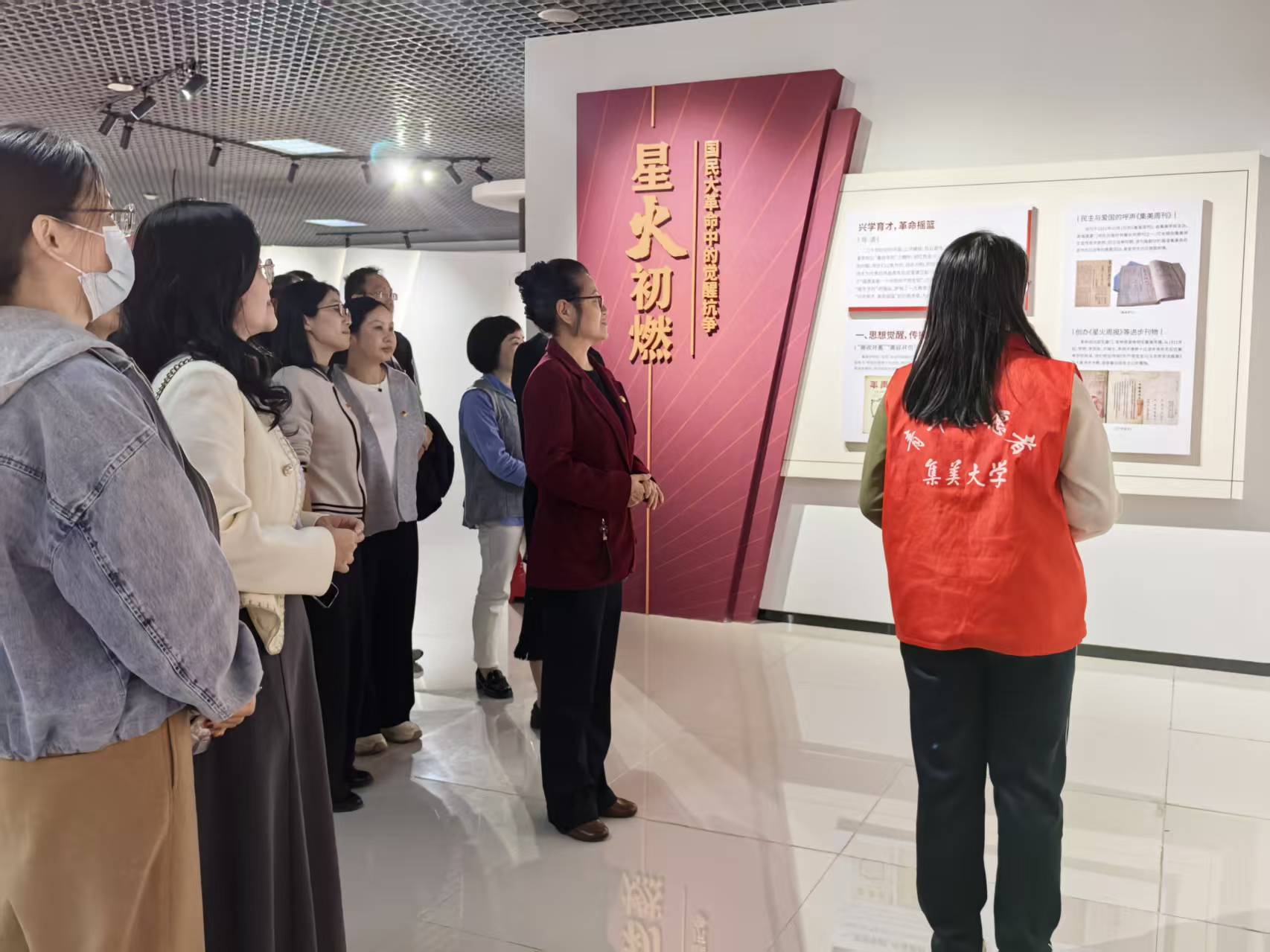 党员们在讲解员的带领下首先参观了“红旗漫卷薪火传——党史中的集大故事专题展”,集美大学(前身为集美学校),以其“兼容并包”的胸怀,孕育了闽南革命的火种,点燃了无数青年心中的希望之光。从国民大革命的觉醒浪潮,到土地革命战争的烽火硝烟;从抗日战争的弦歌不辍,再到解放战争的黎明坚守,集美大学始终与国家命运同频共振,与民族复兴血脉相连,一代代集大人前赴后继,用热血与生命谱写了一曲曲壮丽的英雄赞歌。党员教师们驻足观看抗战时期集美学村迁徙办学、师生投身爱国运动的珍贵史料,沉浸式感受学校发展背后的精神脉络与红色基因。