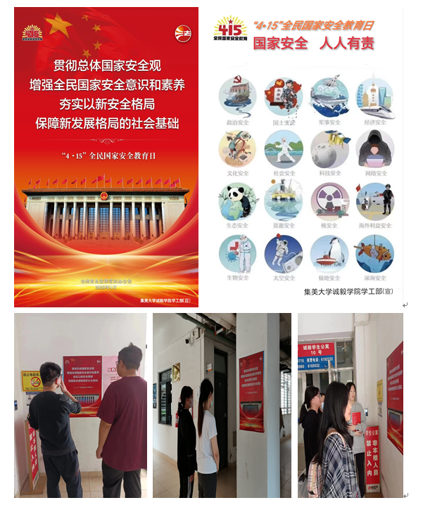 今年全民国家安全教育日的主题是“贯彻总体国家安全观,增强全民国家安全意识和素养,夯实以新安全格局保障新发展格局的社会基础”。学工部印制了宣传教育主题海报,张贴于各学生社区组团入口显眼位置;制作了以国家安全16个方面的基本内容为主题的贴纸,在食堂门口派发给同学们,积极营造维护国家安全的良好氛围,扩大活动覆盖面和影响力。