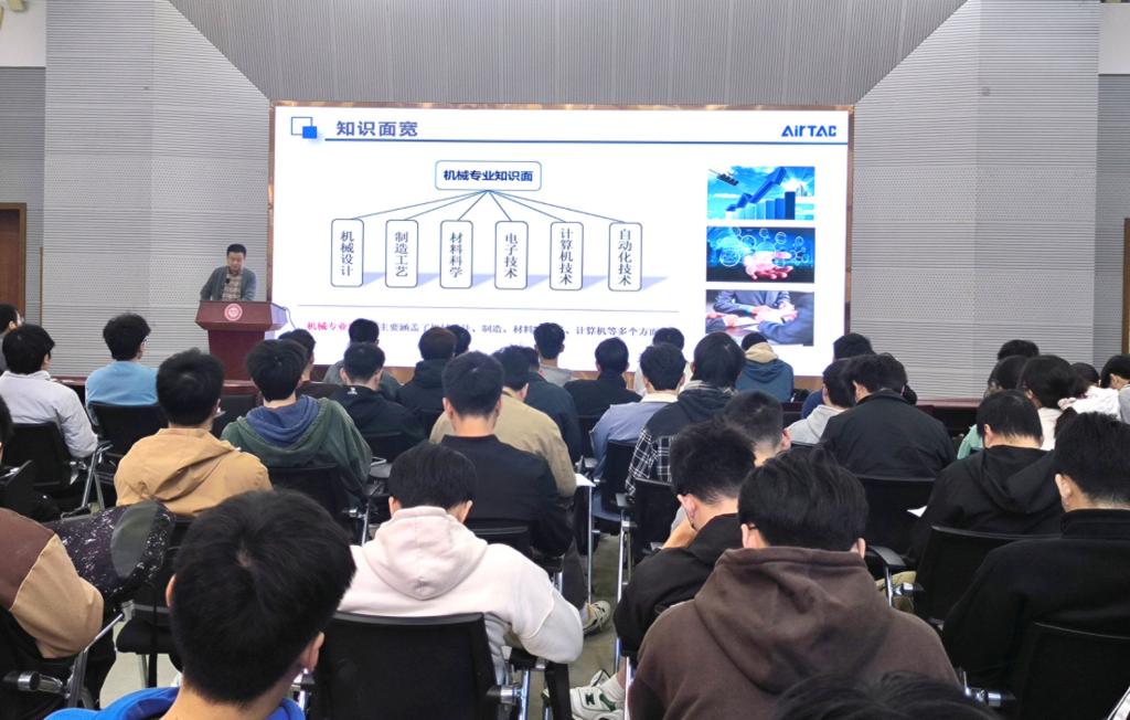 江勇副总经理首先为同学们介绍了亚德客公司的概况,同时也对学生就业的四项基本条件进行了深入的阐述。在制造强国的时代背景下,专业人才需要向知识面广、有一技之长和有创新能力的复合型人才转型。江勇以多年的行业经验为同学们讲述了求职就业需要具备的专业素养和能力,不断提高竞争力,在校期间努力提升自身的实力,为未来职业发展提供重要保障。最后,江勇为在场新生送上寄语并热情地为同学们解答疑惑。