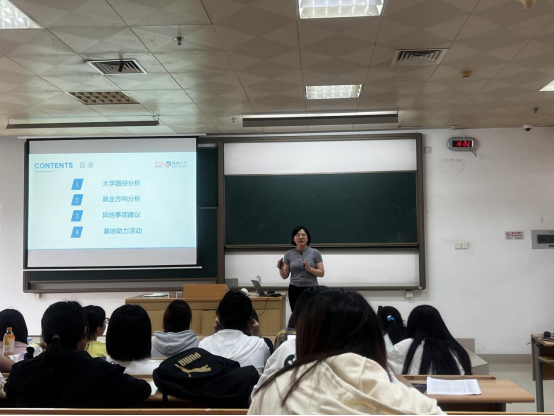 讲座中,主讲人以就业形势为切入点,从“就业数据简析”“大学路径分析”“就业方向介绍”“基地助力做规划”四个方面展开,结合真实案例深入分享英语对口行业就业方向,拓展学生就业思路。同时,鼓励学生客观分析自我,努力提升专业本领和求职本领,逐步在实践中探索出适合自己的发展路径。