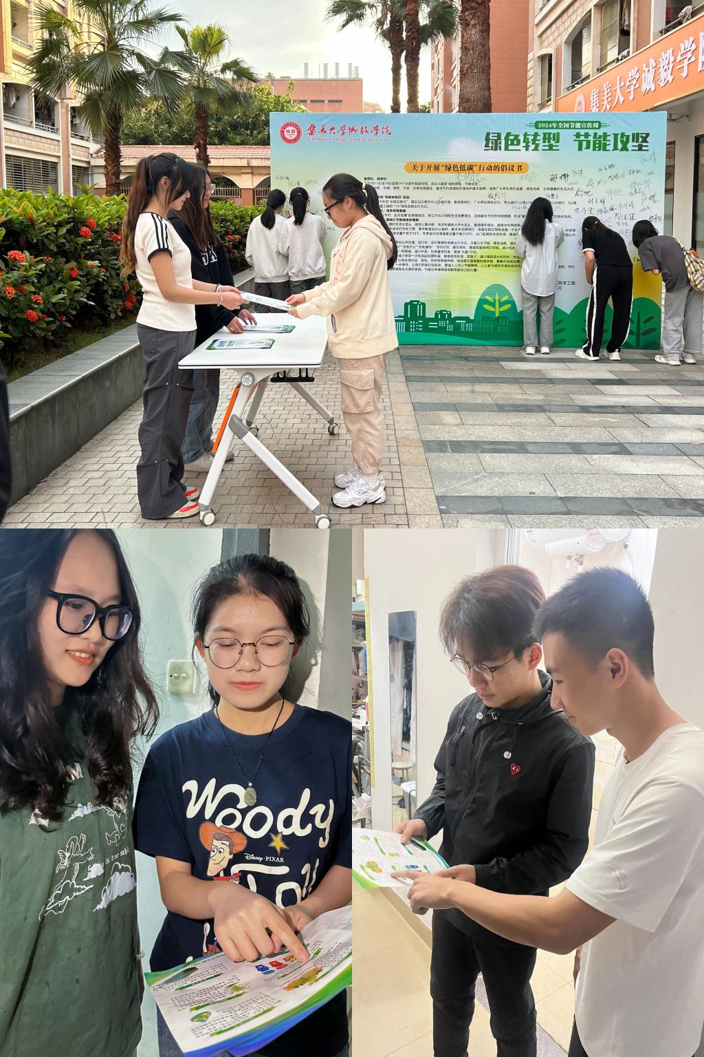 活动紧扣“绿色转型,节能攻坚” 和“绿色低碳,美丽中国”主题开展,精心制作了节能宣传单、海报、倡议书和横幅。院自律会通过发放节能宣传单,现场讲解、签名等方式,向师生宣传普及日常生活中的节能知识,增强节能意识,教育引导师生养成节能低碳环保的良好习惯,并向全校师生发起关于开展“绿色低碳”行动的倡议:一是要积极参加“低碳体验日”活动;二是要勤俭节约,传承传统美德;三是要争做表率,做践行节能减排的楷模。