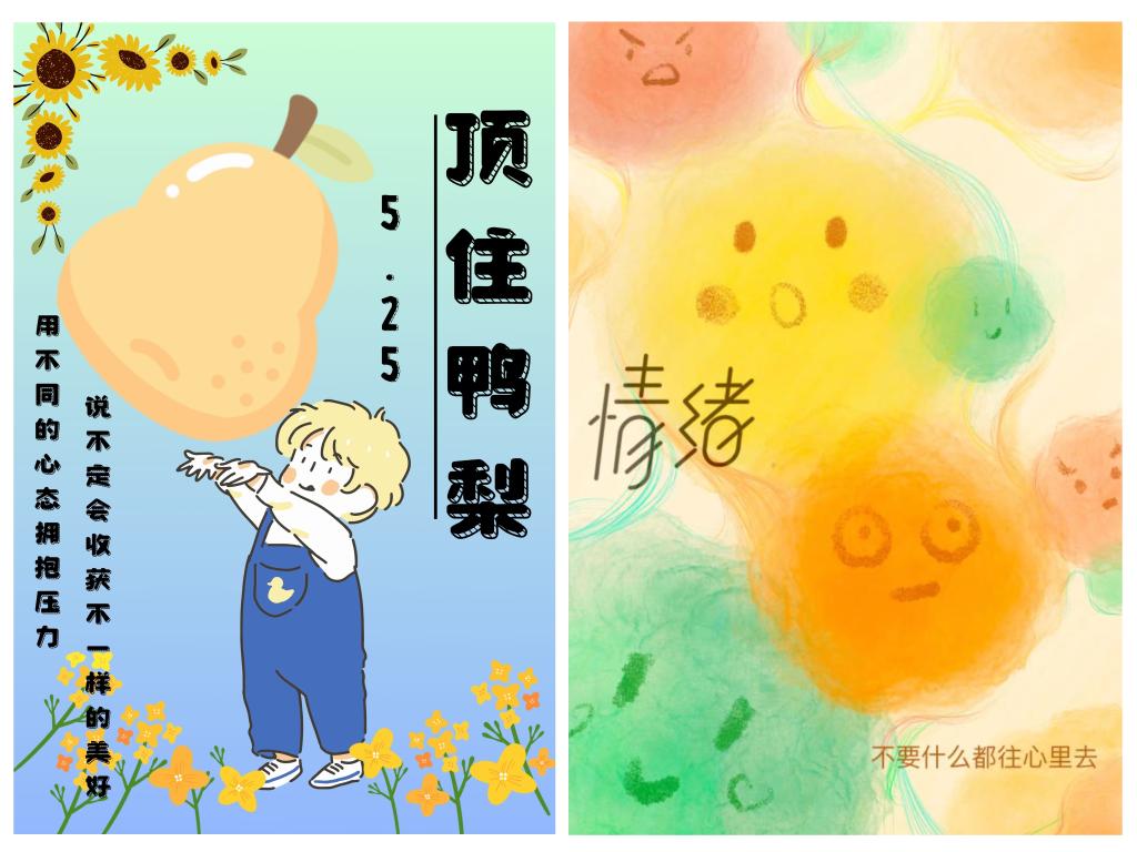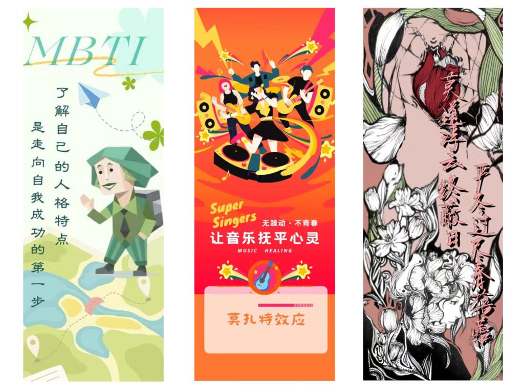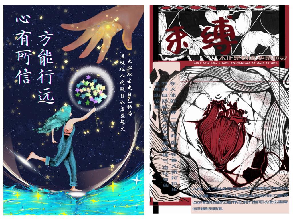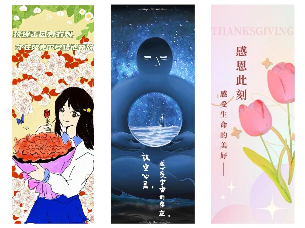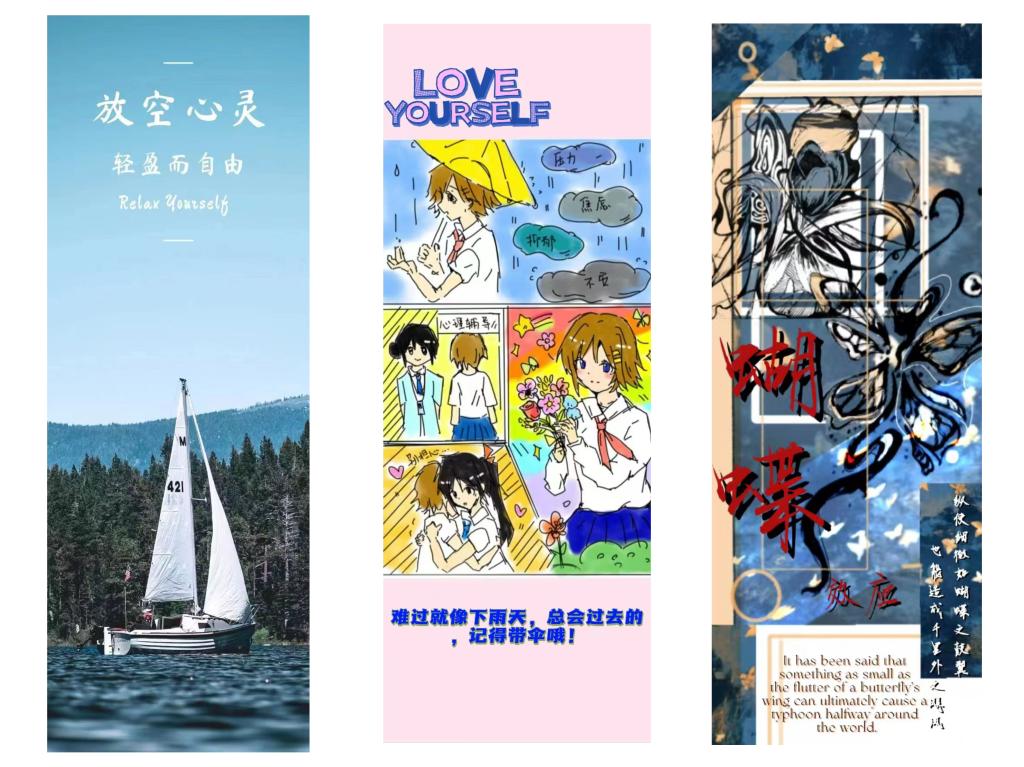 为了提升大学生的艺术美感并营造积极的心理健康氛围,我院举办了第四届“525心理健康主题海报征集活动”及书签征集活动。《顶住鸭梨》《心有所信,方能行远》《束缚》《总有人伸出援手》等海报作品以其独特的视角和深刻的内涵脱颖而出。这些作品连同心理幽默图片、视错觉图片、洞察力测试、趣味心理测试、压力测试等,在一站式学生社区进行了广泛宣传和展览。