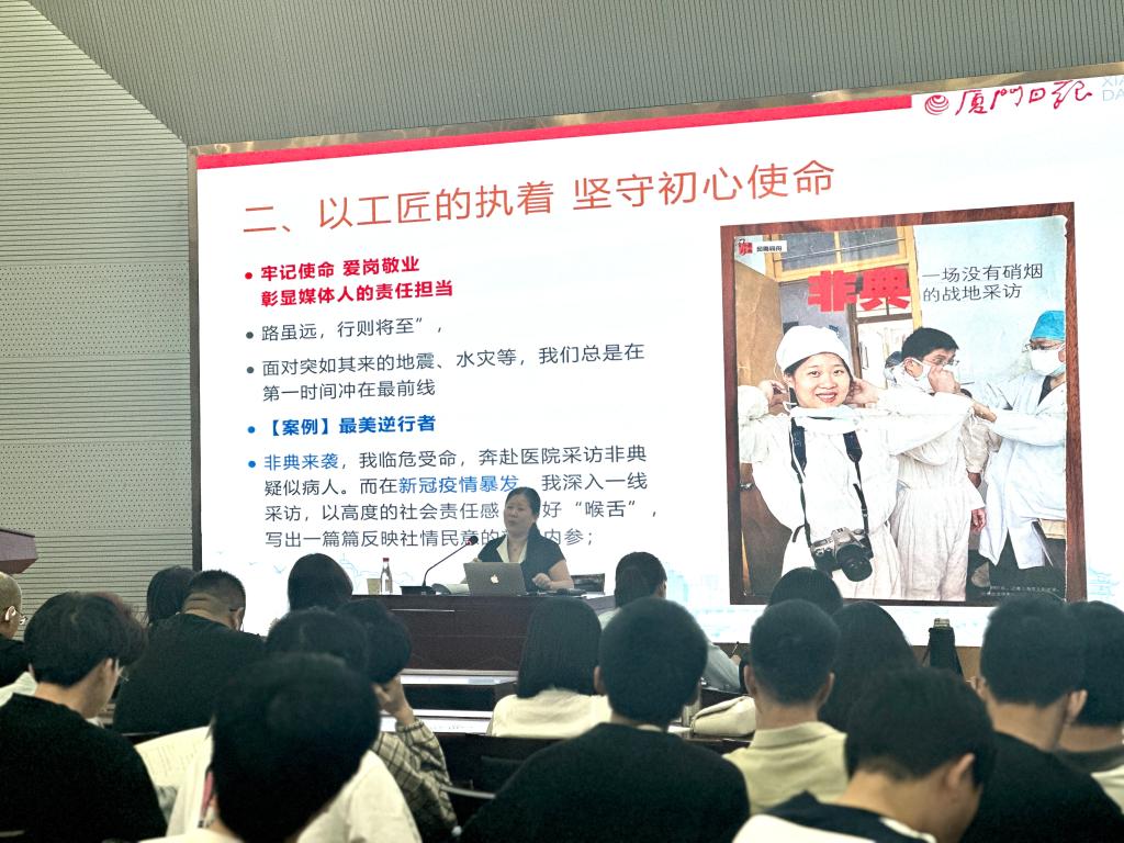 江海苹围绕打造“精气神”,弘扬正能量、以工匠的执着坚守初心使命、以守正创新精神迎接新时代挑战三部分进行分享。结合传承弘扬嘉庚精神,她分享了自己亲历、亲见的真实采访故事和心路历程,鼓励师生始终保持对工作学习的热爱、坚守和执着追求以及不断学习和创新的精神。此外,她讲述了在采访中近距离地感受劳模、工匠的动人风采,鼓励大学生要以劳模、工匠为榜样,传承弘扬劳模精神、工匠精神,树立正确的世界观、人生观和价值观,将“诚毅”二字心中藏,争当弘扬“嘉庚精神”的先锋,努力学习专业知识,提升自己的综合素质。要勇担使命,脚踏实地做好每件平凡小事,在创新突破中筑就“敢闯敢试、勇立潮头”的“匠心人生”,在平凡的岗位上成就不平凡的自己,为新时代社会发展贡献青春力量。