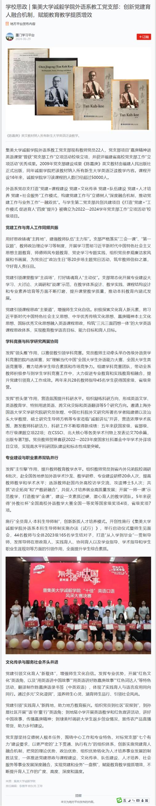 6月29日,学习强国发布报道《集美大学诚毅学院外语系教工党支部:创新党建育人融合机制,赋能教育教学提质增效》。