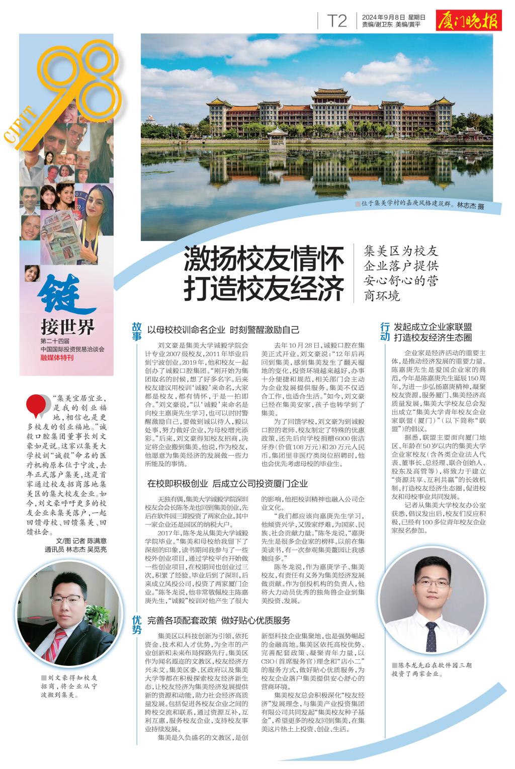 9月8日,厦门晚报关注报道我院校友刘文豪、陈冬龙响应集美区委、区政府以及集美大学校友总会号召,将创办企业落户集美,以实干创新传承弘扬嘉庚精神,践行诚毅校训,与母校共同打造校友经济生态圈,共促事业繁荣发展。