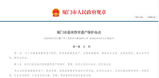 《厦门市嘉庚教育遗产保护办法》于2024年9月19日厦门市人民政府令第189号公布,自2024年10月21日起施行,以法之名,传承嘉庚遗产,弘扬嘉庚精神,将嘉庚教育遗产保护好、传承好、利用好,推动嘉庚教育遗产申报世界文化遗产项目,是继承和弘扬嘉庚精神的一次生动实践。通过立法,着力解决嘉庚教育遗产保护、利用过程中存在的深层次问题,切实加强嘉庚教育遗产(尤其是不可移动的文物及历史建筑)的保护,加大对嘉庚教育思想的研究、挖掘和阐释力度。