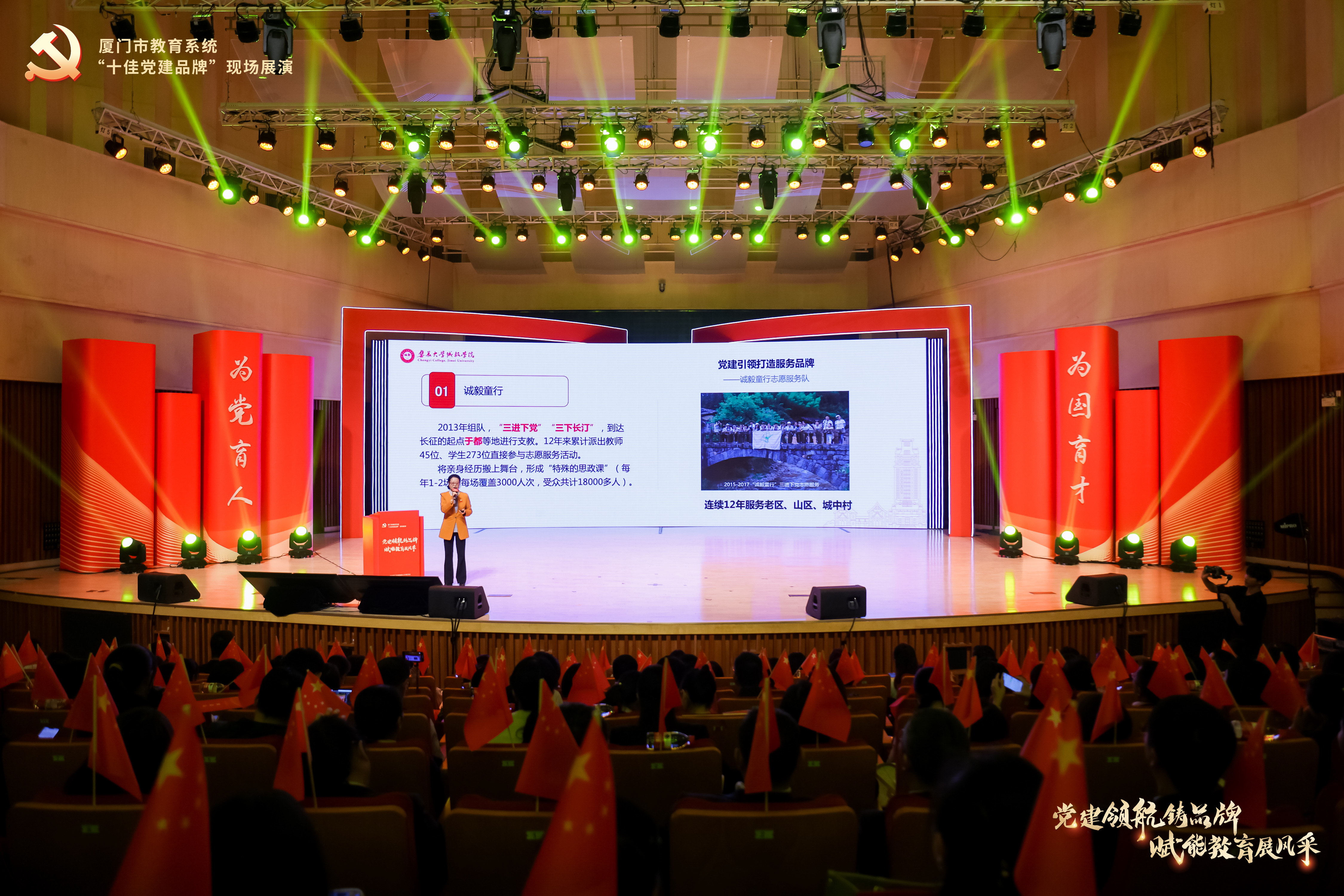 今年是厦门市教育系统第二次推出“十佳党建品牌”,经过前期市各基层党组织择优推荐申报、品牌材料初评及现场考察复评等环节,历经45进31、31进20“大比拼”,20个党建品牌进入第三轮现场展演,以初评占20%,复评占30%,展演占50%的比例,形成综合得分,评选出全市教育系统“十佳党建品牌”。