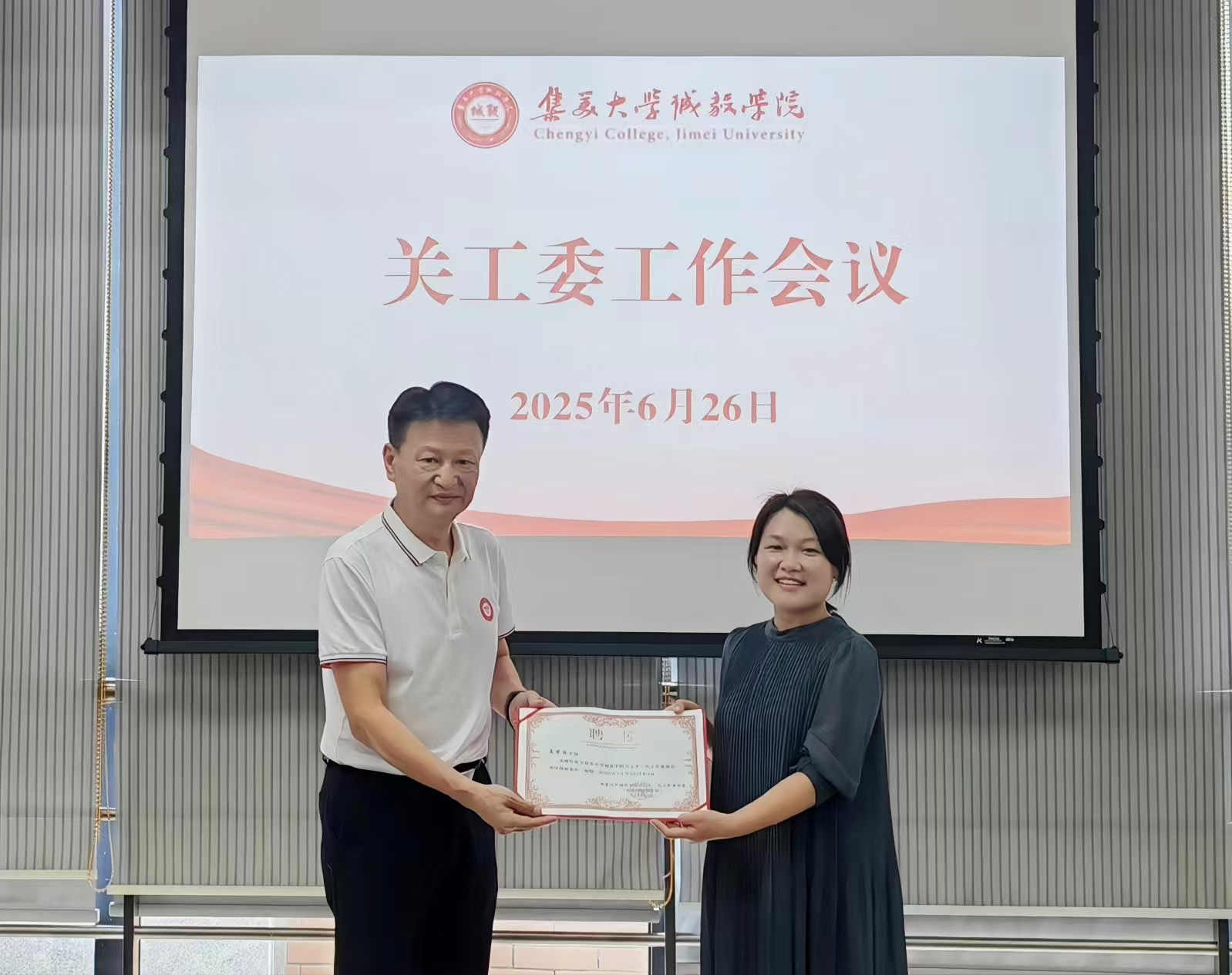 会议聘任智能制造与机械工程系夏荣菲博士、人文科学系中文2295班学生党员周苇为学院关工委首批青年教师委员和学生委员。