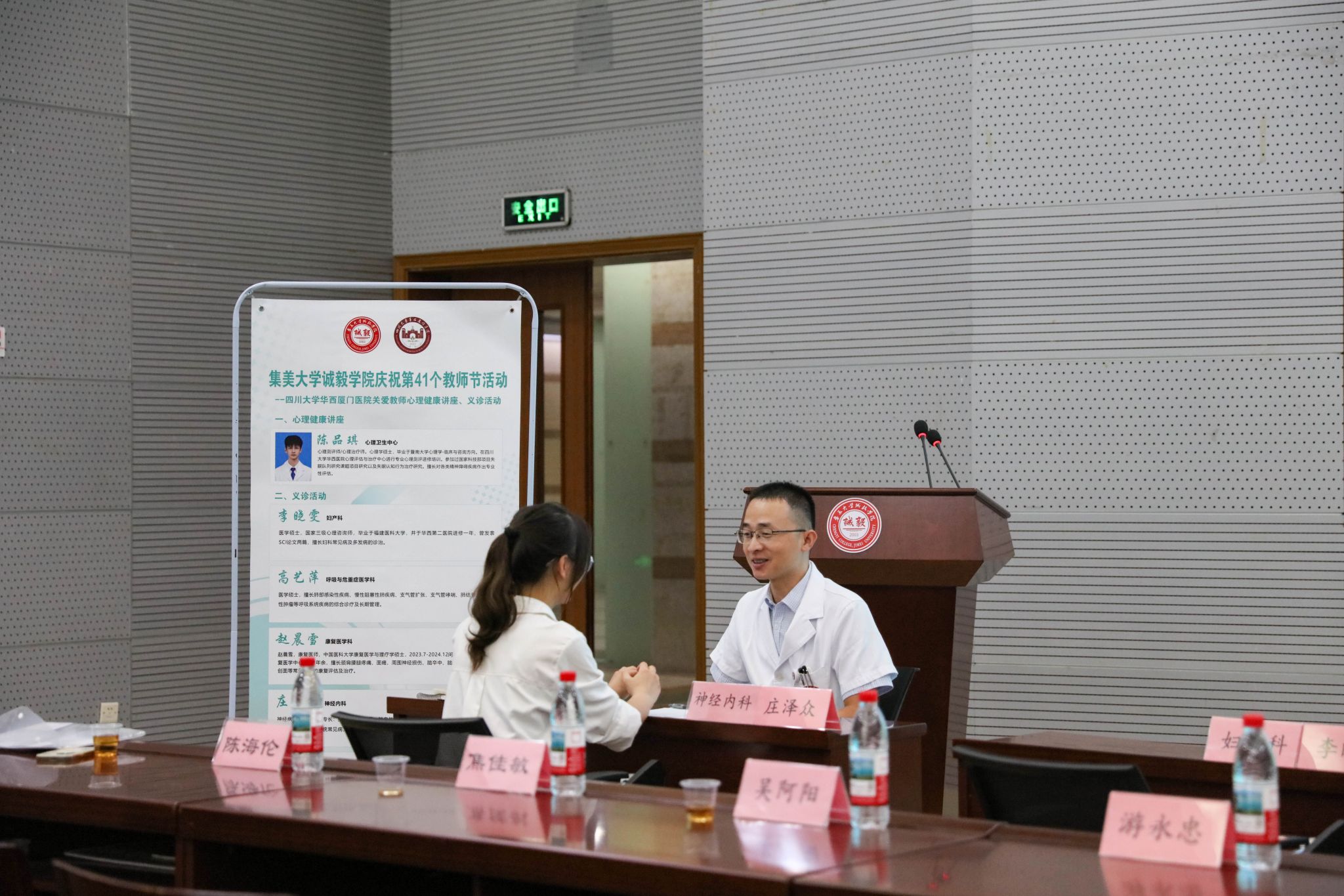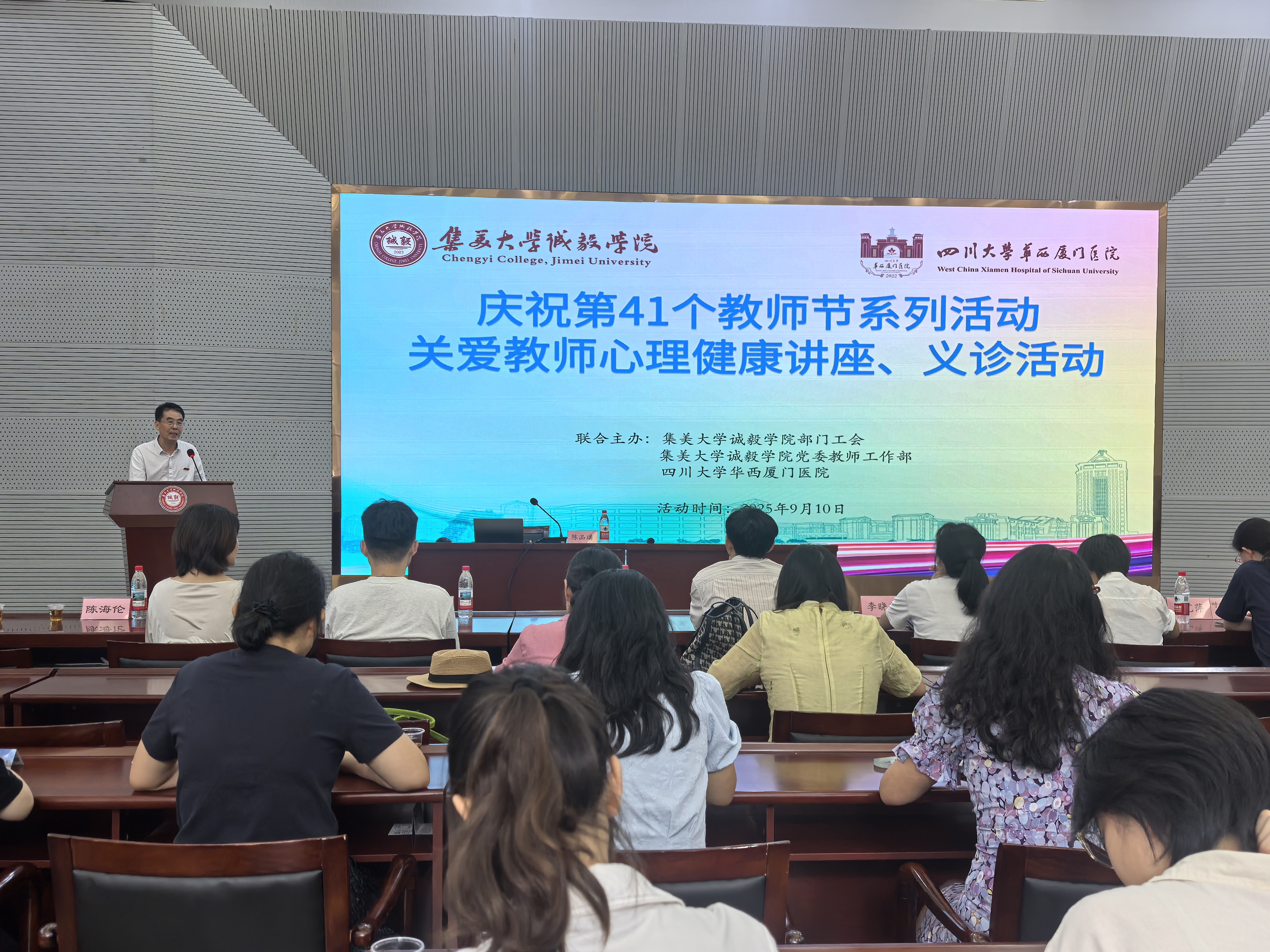 为庆祝第41个教师节,关爱教师身心健康,9月10日下午,我院举办关爱教师心理健康讲座暨义诊活动,特邀四川大学华西厦门医院提供专业医疗服务和健康科普。院部门工会主席游永忠主持活动,并向全体教师致以节日的祝贺和诚挚问候。