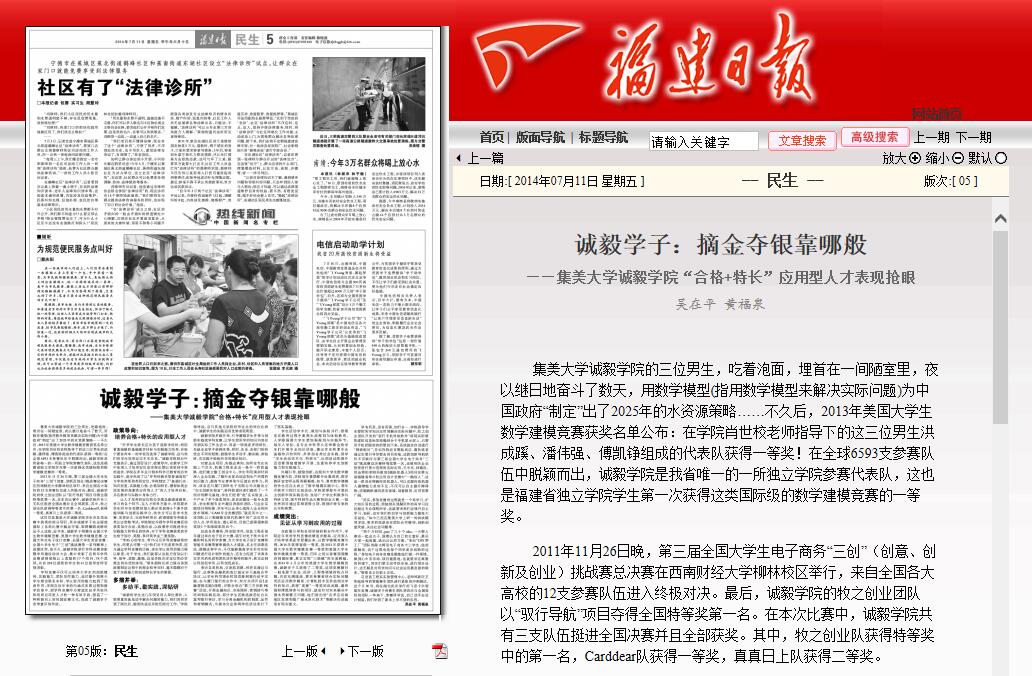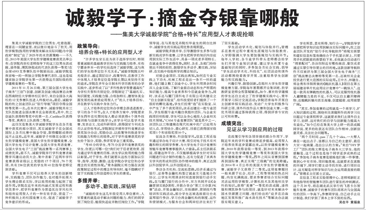 2014年7月11日,《福建日报》第5版刊发了集美大学诚毅学院学生学科竞赛摘金夺银的长篇通讯,现全文转载如下: