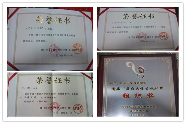 11月16日晚,首届厦台大学生戏剧节落下帷幕,集美大学诚毅学院改编参赛短剧《马蹄声碎》获短剧比赛剧目三等奖,《诚毅人生.陈嘉庚》获短剧比赛纪念奖,我院学生社团云跃剧社社长陈渊同学(会计1191)获短剧《马蹄声碎》最佳导演奖,同时我院获得优秀组织奖。