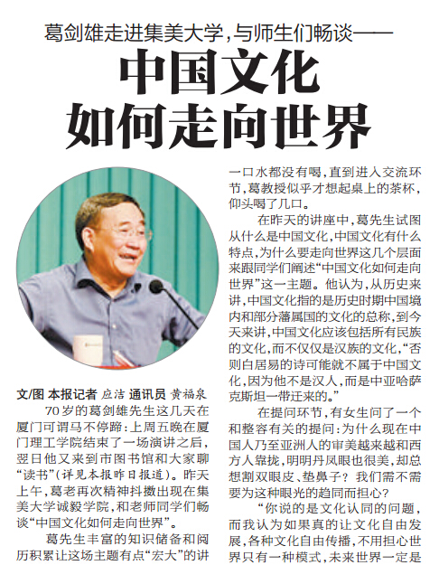 4月19日,著名历史学家、央视《百家讲坛》主讲人、复旦大学葛剑雄教授应邀与师生们畅谈“中国文化如何走向世界”。院领导叶光煌、郑力强、连志崧,我院师生代表近千人听取了报告,报告由诚毅学院优秀校友、厦门音乐广播双语主持人张铭泉主持。