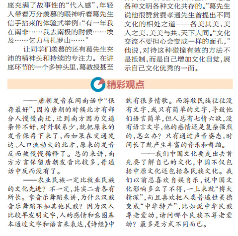 在昨天的讲座中,葛先生试图从什么是中国文化,中国文化有什么特点,为什么要走向世界这几个层面来跟同学们阐述“中国文化如何走向世界”这一主题。他认为,从历史来讲,中国文化指的是历史时期中国境内和部分藩属国的文化的总称,到今天来讲,中国文化应该包括所有民族的文化,而不仅仅是汉族的文化,“否则白居易的诗可能就不属于中国文化,因为他不是汉人,而是中亚哈萨克斯坦一带迁来的。”