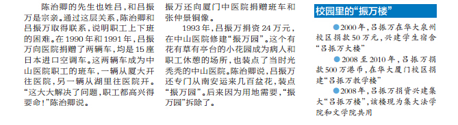 1993年,吕振万捐资24万元,在中山医院修建“振万园”。这个有花有草有亭台的小花园成为病人和职工休憩的场所,也装点了当时光秃秃的中山医院。陈治卿说,吕振万还专门从南安运来几百盆花,装点“振万园”。后来因为用地需要,“振万园”拆除了。