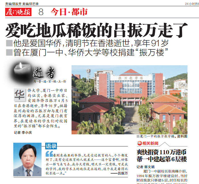 华侨大学、厦门一中昨日均证实,香港实业家、爱国华侨吕振万4月5日在香港逝世,享年91岁。祖籍泉州南安的吕振万却与厦门有深厚的渊源,尤其是厦门教育界,在厦读书的学生们对校园里的“振万楼”都不会陌生。