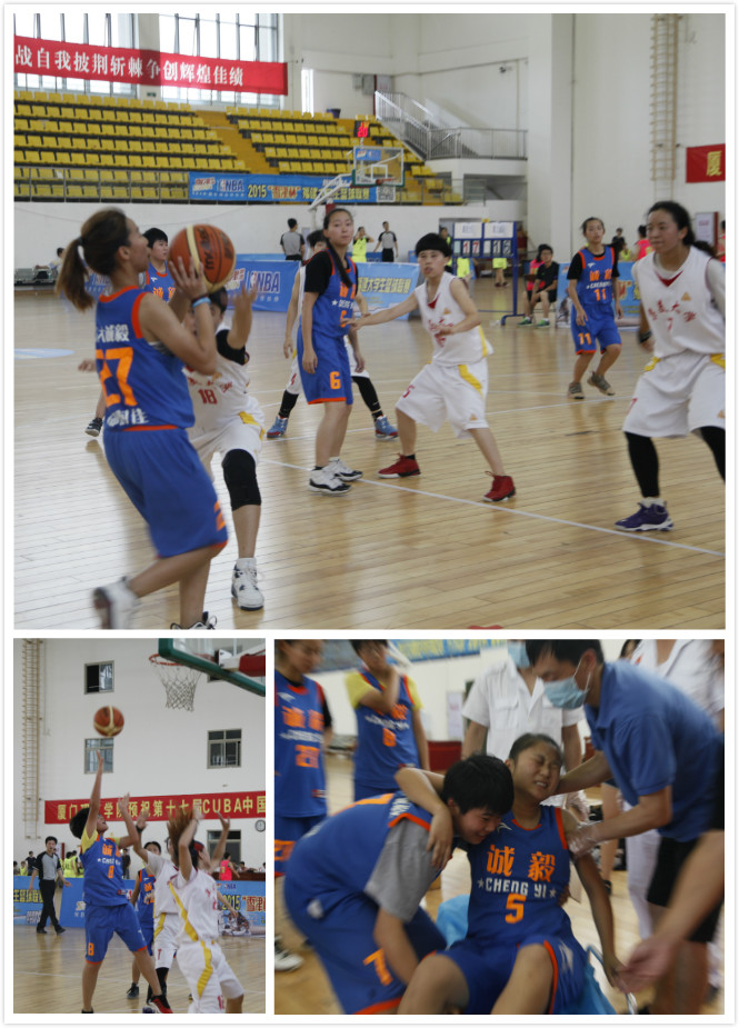 女篮比赛共有6支球队参与,分别为厦门大学、集美大学、集美大学诚毅学院、厦门海洋学院、漳州职业技术学院、厦门医学高等专科学校。首场迎战实力超群的厦门大学,我院采取休养生息力拼下一场的策略,最终败北。第二场迎战实力不俗的漳州职业技术学院,我院女篮力拼防守最终顽强拿下比赛。第三场迎战海洋学院,海洋学院主力球员场均30分实力强悍但得分点集中是致命弱点,在教练精心布置下,海洋学院主力球员全场拿下不到10分,我院优势明显取得连胜;第四场迎战实力较弱的厦门医高专,女篮轻松拿下比赛。最后一场迎来我们老对手集美大学,开局我院女篮主力中锋脚崴受伤离场,紧接着主力后卫、主力前锋于运动战中接连受伤,以致我院女篮以非主力球员打完后三节赛,最终惜败,但仍以积分与胜负关系有惊无险获得本届赛事金奖!