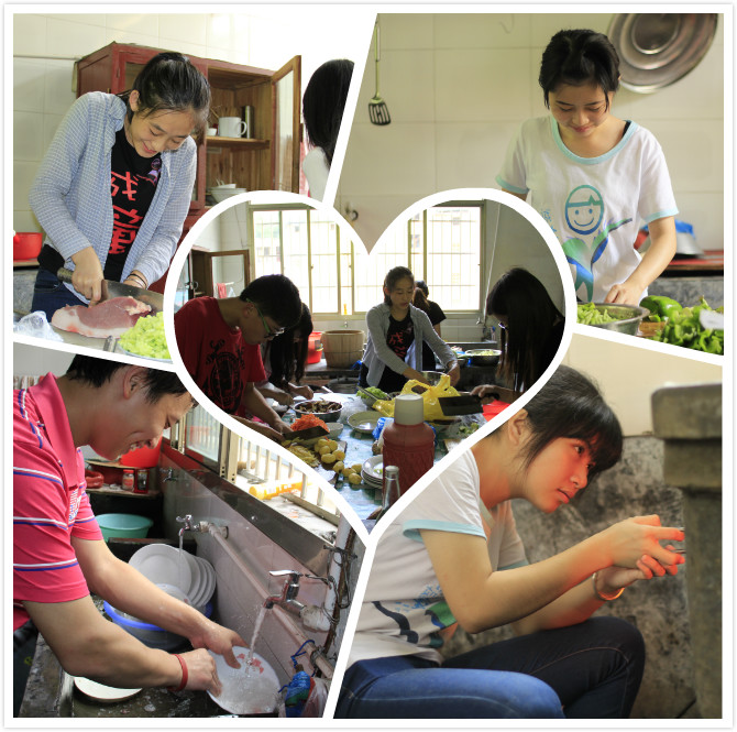 吃惯了“食堂”、“外卖”的队员们,到这里却要轮流做饭,负责队员们的饮食。早上五点多,炊事班的队员们就要起床买肉,因为村里的肉铺每天只杀一头猪,去晚了就买不到猪肉。为了保证营养,每天早上都有水煮蛋。担心大家吃腻,炊事班又换着花样做,煎蛋、炒蛋、蒸蛋……格外用心。吃完饭洗完碗,炊事班又要再次出门采购新鲜蔬菜水果。而这时,男生总会对女生喊上一句:“大妈们,九点啦,我们去买菜!”采购回来后,搬柴、烧柴、洗菜、炒菜……厨房里叮叮当当的声音显得格外温馨。每个炊事班都用心做出拿手好菜,上完课的队员们总是狼吞虎咽,赞不绝口。大家围坐在一起,有说有笑,和谐温馨,宛如一家人。带队老师叶泽权说:“对大多数同学而言,以团队作战方式保证二十几个人的吃饭问题几乎从没有经历过,甚至自己平时就很少或从没有下厨做过饭。炊事班的设立就是让大家体验大团队做饭的乐趣和成就感,进而理解父母隐藏在日常生活中的多年来看似微不足道的爱心和苦心,增强自己的生活自理能力,同时促进大团队的融合。”
