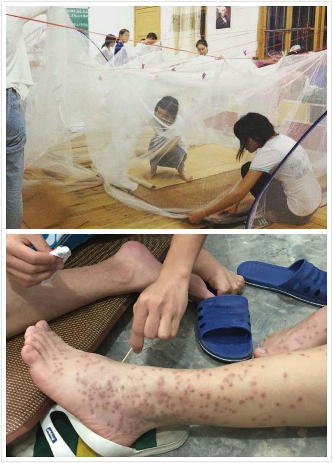 一路辗转颠簸,历经2个小时的动车,4个小时的大巴,“诚毅童行”支教队才抵达下党乡。在教室里放上木板、铺上草席、搭起蚊帐,队员们的住宿就算解决了。但最艰难的不是打地铺,而是蚊虫的叮咬。只一两天的时间,每个队员的手上、脚上都布满了大大小小的包。每天睡觉前,队员们都要把蚊帐塞得严严实实,才不会有蚊虫叮咬。队员陈伊颖无奈地说道:“每天醒来后睁开眼,蚊帐顶部又落了十几只蚊子。”在所有队员中,王亚洲的症状最为厉害,他说:“每天晚上都会痒,并且痒的睡不着,白天上课也时不时地会发痒。身上起的大泡,我自己看着都害怕,但是队友并没有嫌弃或躲避我,而是不停地关心我,让我觉得真的很感动。虽然这段时间很苦,很难受,但是我从未忘记我们来这儿的目的。”