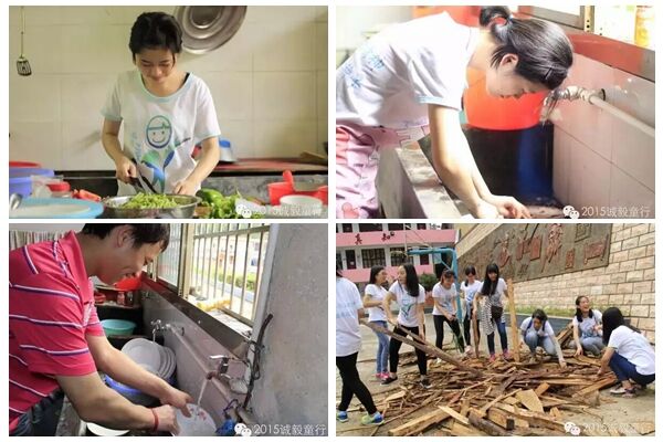 在“诚毅童行”中有这样一个小组织——“炊事班”。所谓“炊事班”,就是把所有支教队的队员们分为三组,以“天”为单位,轮流做饭。每天的炊事班主要负责队员们的饮食,闲暇的时候协助非炊事班的“老师们”维持课堂秩序。