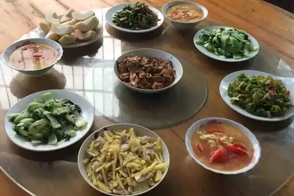 早上五点多,炊事班的同学们就起床了,因为村里的肉铺每天只杀一头猪,去晚了就买不到猪肉了。学校附近只有两家蔬菜店,两天才进一批新鲜的蔬菜,所以炊事班要尽早将需要的蔬菜都购买好。买完青菜和肉,炊事班便开始准备早餐了,早餐主食一般为稀饭,配点青菜、鸡蛋、花生、包子等。早餐过后,炊事班又开始忙起来了,刷碗、搬柴火、准备午饭。为了让支教队的队员们吃得有营养,菜谱中有鱼有肉、有菜有蛋,饭后还有新鲜的水果,可丰盛了!晚饭是六点半开始的,炊事班一般四点就开始准备了。晚餐和午餐一样,五菜一汤,饭后大家一起吃水果。辛苦了一天的同学们都吃得狼吞虎咽,津津有味。