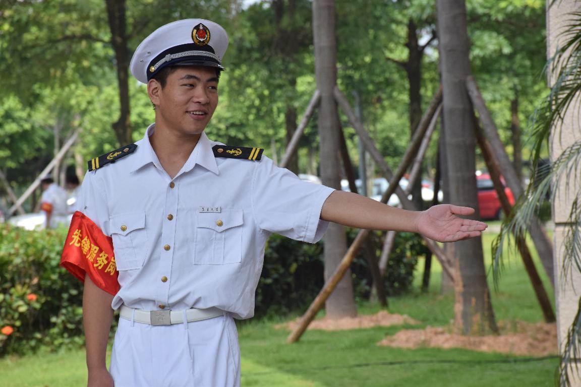 校道上,身着白色制服的志愿者在车来车往的路上显得尤为独特,他们是来自商船系航海、轮机专业的学生。九月厦门的中午仍然艳阳高照,他们一个个头顶烈日,在学校道路边帮助指挥车辆。来自轮机1491的张文星就是其中一人,他一边疏导车辆、指挥车辆方向,还一边为新生指路,答疑解惑。当被问及工作是否辛苦时,他只是轻松地一说:“虽然好热,明年我还想继续参加迎新工作。”