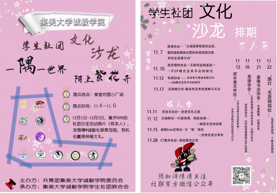 “学者会”,汇集多个领域的学者,通过讲座、互动等活动形式立体地展现互联网时代的学者风范;“文人聚”,各方文人齐聚为诚毅学子完美诠释快餐文化时代的文人情怀;“娱人季”,娱人们通过音乐通过表演,在光影间张扬诚毅弄潮儿的娱人精神。在这浪漫的深秋,此次文化沙龙活动再为校园添浓墨重彩的一笔。来吧,把视线从枯燥的书籍和冰冷的手机屏幕中解放出来,让绽放的洋紫荆点亮你的双眸,让社团文化沙龙点亮你的生活。