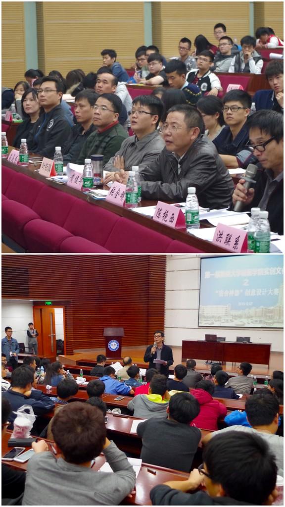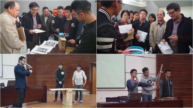 大赛意在加强我院学生创新意识和实践动手能力的培养,鼓励同学通过创新思维进行综合设计和工艺制作,更好的发动广大学生踊跃参与到课外科技创新实践活动中来。活动从11月16起进行项目征集,经过前期宣传和准备,吸引了来自机械工程系、商船系、信息系等共150余名同学报名,并成功组队三十余组。经过初赛、复赛的层层选拔,共有12支队伍进入决赛答辩,对实体作品进行了展示并接受评委提问。参赛作品种类丰富,创新性十足——作品“神龙宝宝”一出场就牢牢地吸引了观众们的眼球,它把镜子、台灯、风扇、时钟等宿舍日常用品结合起来,玲珑而不乏实用;“多功能储物柜”更是把大型桌子,大型衣柜等宿舍大件融为一体,帮宿舍空间进行了一次“大瘦身”;“A型简易鞋架”则是从扩充鞋架容量与方便鞋子存取角度出发,利用单向塑料钩与支撑板的结合创造了一个与众不同的鞋架;“可折叠简易书桌”则是为宿舍上铺同学设计的“神器”,书桌依靠床铺边缘支撑,既方便上铺同学的学习生活,又不影响下铺同学日常作息;作品“多功能桌”,其设计理念是方便学生电脑的放置使桌面不凌乱,无论是藏线暗格的设计还是LED灯的使用或是接口的分配,都能看到设计者付诸的心血;“男生们的神器”——“变型鞋架”则专为晾晒潮湿的鞋子而设计,活动的架台有利于采集充足的阳光,可为运动后或长时间放置的鞋子除菌保洁;作品“多功能升降桌面”的出场,成为了全场关注的焦点,该作品将台灯照明、电脑桌、挂钩挂耳机、排插放置、读书、写作业等功能集成一体,采用平行四杆结构,一体化的设计实现了空间利用的最优化并体现了机械结构设计的理念,颇受大家青睐;最后登场的“快速换袋垃圾桶”,更是从日常生活出发,设计简单而不乏创意,制作成本低廉而不乏实用,便于推广到学生宿舍中去。整场决赛,精彩不断,评委老师就参赛作品的设计理念和设计知识运用进行了精彩的点评和深入问询,为设计者们进行作品优化起到了很大的启迪作用。例如建议“多功能储物柜”设计者在作品下方添加轮子,从而更便于柜子的拿取;通过对书桌设计的观察,评委老师们建议在书桌上添加更多便捷的设计,如存放杯子,铅笔等物品的装置;建议选手修改作品中铰链的位置与作品的摆放位置,使得整个设计更加合理化等等。