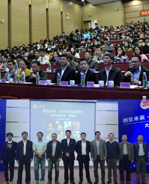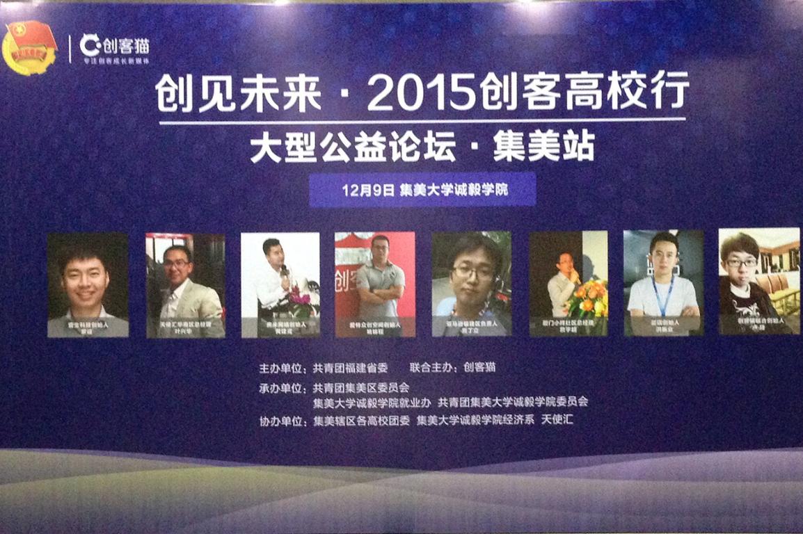 12月9日下午,团省委、“创客猫”联合主办创见未来·2015创客高校行(集美站)论坛在我院隆重举办,各路创业大咖汇集我院助推“创新创业”浪潮。厦门团市委经济部部长周奕麟,集美大学校长助理、诚毅学院院长叶光煌,集美大学团委副书记兰莉芸,集美团区委副书记邓方园,诚毅学院副院长黄义新,诚毅学院党委副书记连志崧,我院各相关部门负责人、各教学院系党总支书记、创业相关老师与各集美高校创业学生代表参加活动。